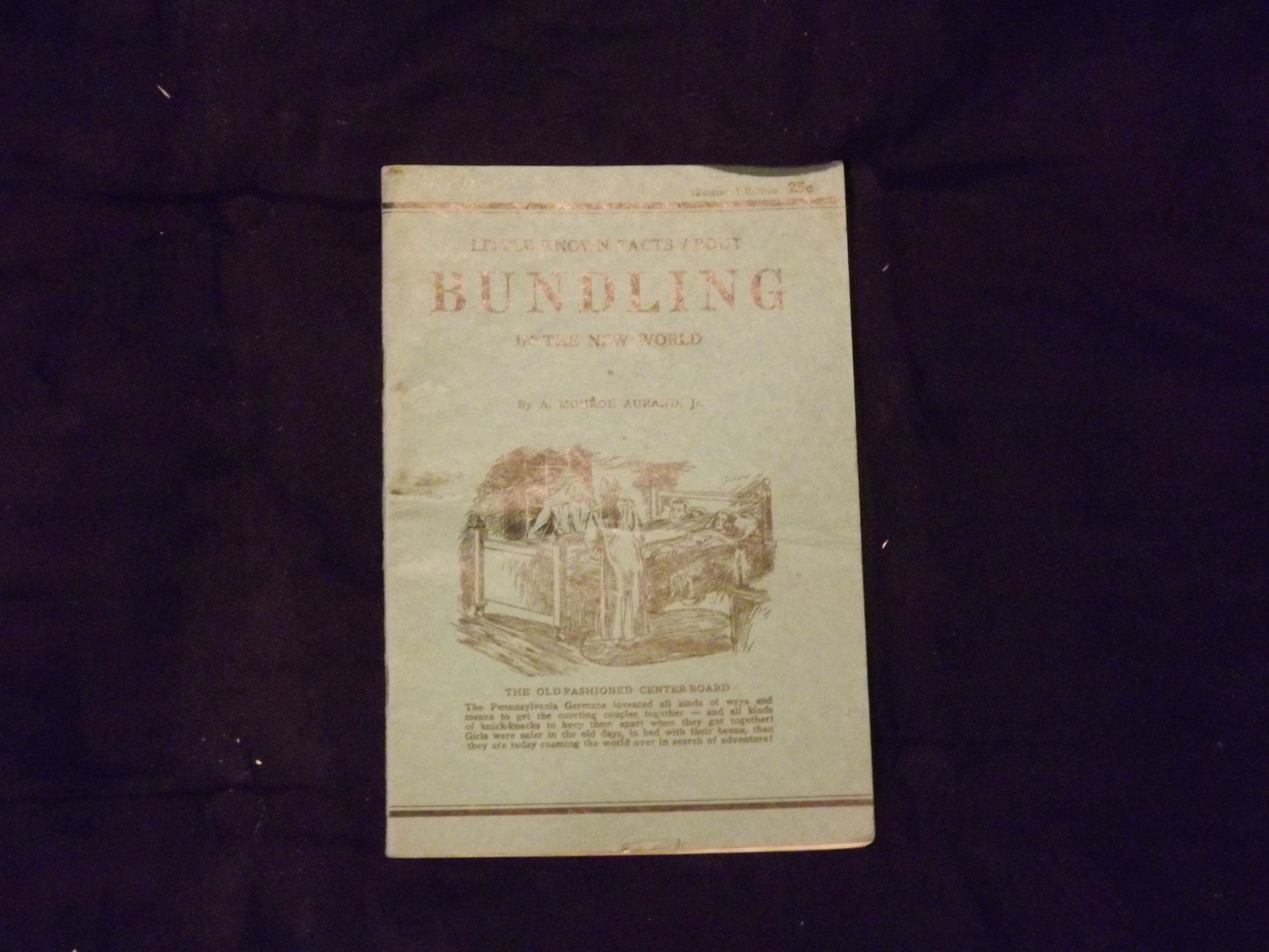 Pamphlet, 8vo, original printed paper wrappers, illustrated, 31,[1] pp. Creased a bit in the center, slight fading; otherwise very good plus. While it is believed to have its origins in England or the Netherlands, bundling is probably best know as a courting practice in colonial America. In fact, Some historians believe that the practice was more common in parts of Pennsylvania. Since dating wasn't much of an option in the 'good old days', couples were allowed to sleep together, often wrapped in blankets to provide a level of intimacy before marriage, but prohibiting sex. To really ensure no sex was possible, a bundling board may have been used too. The author of this work attempts to provide some historical context to the practice.