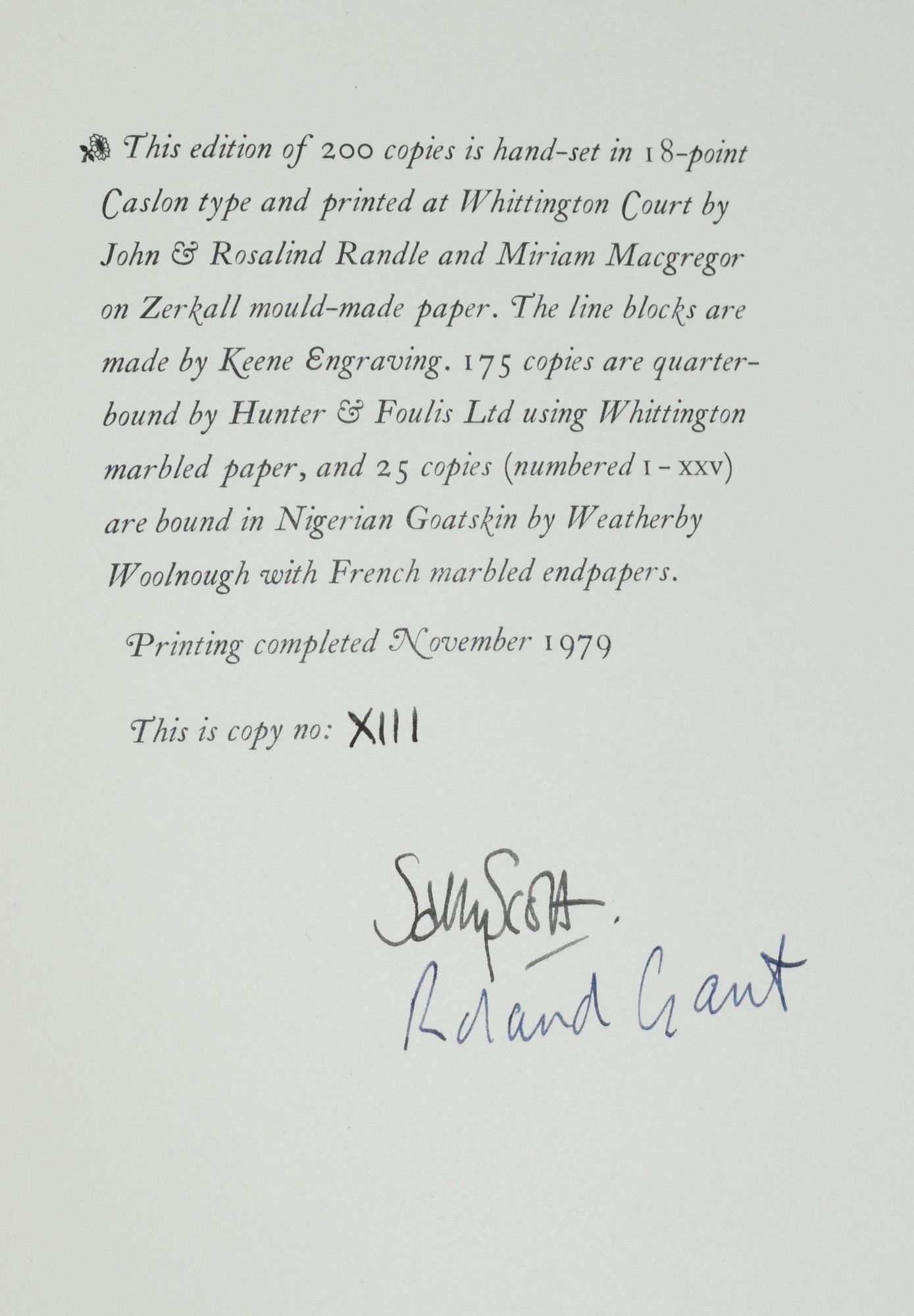 London: The Whittington Press & William Heinemann, 1979. Limited Edition, numbered XIII of XXV from a larger limitation of 200. Full Leather. Near Fine binding. Sally Scott. Signed by Sally Scott and Grant on the colophon. Bound as issued in full beige Niger by Weatherby Woolnough--those from the larger limitation were quarter bound; a lovely production with a bold vignetted blocked in blind on the upper cover; housed in a publisher issued marbled paper covered slipcase;. Near Fine binding.