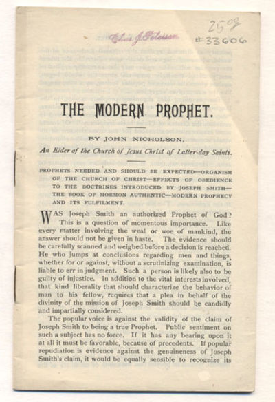 [Salt Lake City, UT]. Paperback. 28pp. Very thin sextodecimo [17 cm] Stapled printed tract. Very good. The pages are lightly creased. There is a previous owner's ink stamp on the front wrap. Contents: Prophets needed and should be expected- Organism of the Church of Christ- Effects of obedience to the doctrines introduced by Joseph Smith- The Book of Mormon authentic- Modern prophecy and its fulfillment.