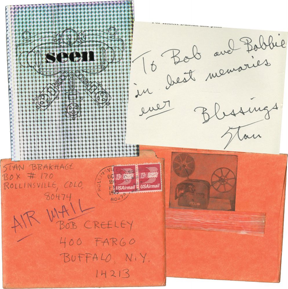 San Francisco: Pasteurize Press / Zephyrus Image, 1975. First Edition. First Edition. An offprint of Brakhage's remarks following a screening of his film, "The Text of Light," at the San Francisco Art Institute, Nov 18, 1974. ASSOCIATION COPY, inscribed to Brakhage's friend, poet Robert Creeley and Creeley's wife on the verso of the title page: "For Bob and Bobby / Best memories ever / Blessings, Stan." With the original mailing envelope, postmarked October 24, 1975, hand-addressed by Brakhage. Brakhage has also tipped on a small image of a projector at the rear of the envelope.