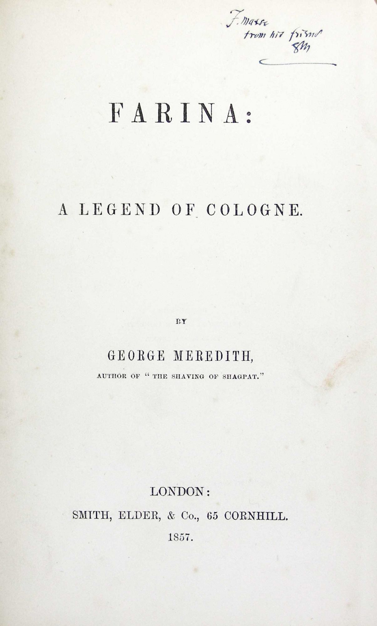 London: Smith, Elder & Co, 1857. Hardcover. Very Good. Hardcover. First Edition of author's second novel. RARE INSCRIBED COPY: "F. Maxse/ from his friend/ GM." George Meredith (1828-1909) was an important author and poet of the Victorian era. He was a friend to many major figures of his time including William and Dante Gabriel Rossetti, Algernon Charles Swinburne, Robert Louis Stevenson, and J.M. Barrie. This book is inscribed to Frederick Augustus Maxse, his dearest friend, who was a hero of the Crimean War. Meredith's book, Beauchamp's Career, was based on the political career of Maxse. In his bibliography of Victorian fiction, Michael Sadleir described Farina as scarce, saying "few Victorian fictions are more seldom seen than [this and three others]." Bound in the original apple-green cloth. It has been professionally recased. The binding is rubbed and soiled but still very nice (According to Sadleir, the binding was both unusual and easily soiled.) Interior pages are clean and bright. Includes July 1857 publisher's catalog. With bookplate of the noted book collector, H. Bradley Martin. Housed in a green cloth clamshell box with paper title and author label to spine. An exceptional association copy in the extremely scarce original cloth. 244 pages plus 16 page publisher catalog. LIT/120312.