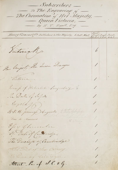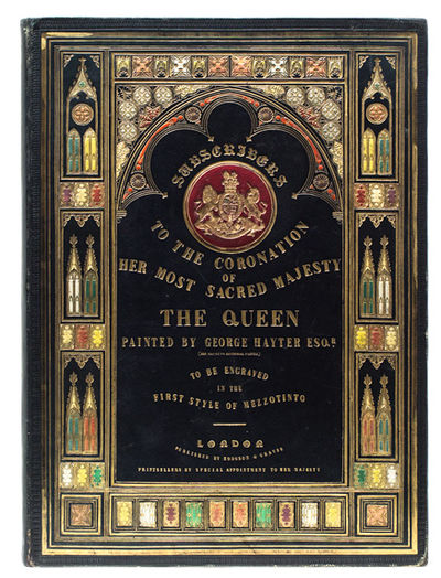 [London, 1841. 21-1/2 pp. with circa 380 signatures. Folio (13-3/4 x 10 inches: 350 x 260 mm.). Original dark blue morocco, front cover stamped in gilt to a cathedral design with numerous color onlays surrounding the gilt-stamped title. Fine. In a custom cloth chemise and half morocco slipcase. 21-1/2 pp. with circa 380 signatures. Folio (13-3/4 x 10 inches: 350 x 260 mm.). A unique order book containing subscriber’s signatures to the mezzotint engraving of George Hayter’s painting of the coronation of Queen Victoria. Subscribers could order first proofs at £12.12, proofs at £8.8 and prints at £4.4 (Queen Victoria ordered 6 first proofs). Other notable subscribers include Victoria, Duchess of Kent (the Queen’s mother), the Duke of Sussex, Leopold of Belgium, and Albert, Prince Consort. The album is beautifully-bound in cathedral binding with multiple color onlays.