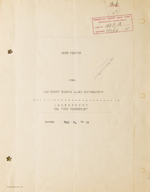 Philadelphia, 1929. 2 pp., docketed. Tan wrappers bound with brass brads, with title typed on upper wrapper, and file stamp of “Paramount Famous Lasky Corp” on upper cover, docketed by Paramount, light creasing and toning. 2 pp., docketed. Wister sells the motion picture rights to THE VIRGINIAN to Paramount, who filmed it the following year with Gary Cooper in the lead. THE VIRGINIAN is considered the first cowboy novel.