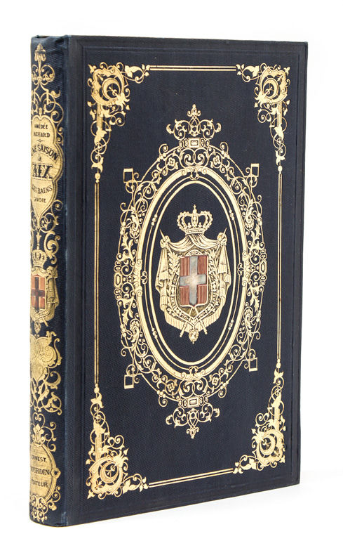 Paris: Ernest Bourdin, 1850. First edition. 17 engravings (4 colored) after Eugène Ginain and one colored map of the Savoie department. [ii], viii, 358, [2] pp. 8vo. Publisher’s blue cloth, blocked in gilt, front cover with filigree border surrounding center oval containing coat-of-arms in gilt and red, rear cover with elaborate cathedral medallion, spine blocked in gilt with title, imprint, and coat-of-arms, a.e.g. Fine. Ginain, Eugène. First edition. 17 engravings (4 colored) after Eugène Ginain and one colored map of the Savoie department. [ii], viii, 358, [2] pp. 8vo. A stunningly fine copy in publisher’s binding, the gilt looking like it was stamped yesterday. “Le cartonnage spécial de l’éditeur est agréablement orné” (Carteret). Carteret III, p. 31