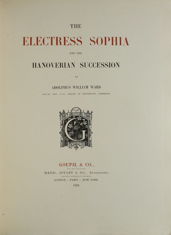 London: Goupil & Co, 1903. Number 81 of 1000 on fine paper. Illustrated with hand coloured frontis portrait of Sophia plus others. [iv] v, [i], 254, [1] pp. 4to. Full green morocco, some rubbing to front joint, else fine. Number 81 of 1000 on fine paper. Illustrated with hand coloured frontis portrait of Sophia plus others. [iv] v, [i], 254, [1] pp. 4to. A study by Master of Peterhouse, Cambridge, of Sophia Charlotte (1668-1705), Queen to Frederick I of Prussia and sister of George I of England.
