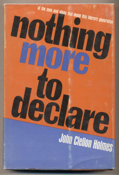 New York: E. P. Dutton & Co., Inc, 1967. First edition. Hardcover. 253pp. Octavo [21.5 cm] 1/2 white cloth with orange paper covered boards, and a blue ink stamped title on the spine. Very good. Very gently soiled and bumped at the extremities. The head of the spine is a little browned. There is a small tear in the paper on the top right corner of the front cover. Minor staining on the edges of the text block. In a very good dust jacket, with rubbing. Age-toned and slightly soiled and creased. The paper at the head of the spine and edges of the folds are just a little bit chipped. The spine of the dust jacket is sunned. From the dust jacket- "At 40, John Clellon Holmes scrutinizes maturity- his own, and that of the recent, memorable generation we called Beat. Nothing More to Declare is one writer's provocative, personal summation of the men and ideas that made his literary generation.