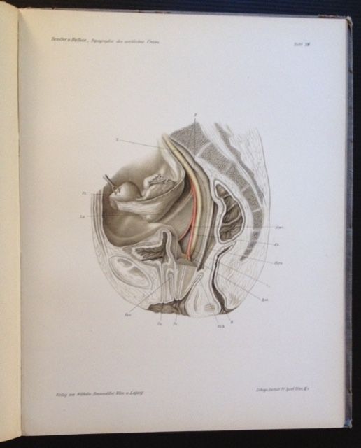 Vienna and Leipzig: Wilh. Braumuller, 1901. 1st. Cloth. Collectible; Very Good. Roughly translated into English as "The Atlas of the Female Uterus--With Special Consideration of the Pathological Conditions and Gynecological Operations". The 1901 1st edition, published out of Vienna and Leipzig. Clean, solid and VG in its gray boards, with very light wear at the tips and spine ends. Includes 32 detailed --and remarkable-- chromolithographs at the rectos and corresponding text at the versos by Drs.Tandler and Halban. Undoubtedly, this folio atlas was the most graphic and comprehensive study of this subject to date and even now, over 110 years later, still impresses for its artistry.