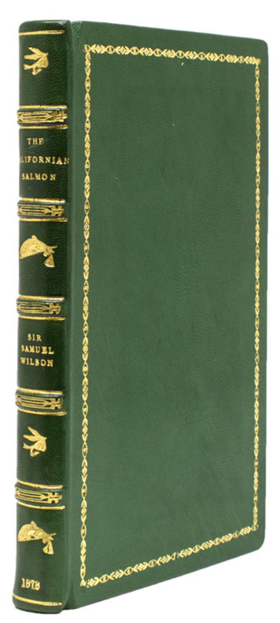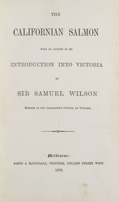 Melbourne: Sands & McDougall, Printers, 1878. First separate edition. Frontispiece albumen photograph of the Trout Ponds at Ercildoune. Pp. [i, title], [ii, blank] [1, preface], [2, blank],[3]-131, [1, imprint]. 1 vols. 8vo. Recent full green morocco, spine titled in gilt. Fine. First separate edition. Frontispiece albumen photograph of the Trout Ponds at Ercildoune. Pp. [i, title], [ii, blank] [1, preface], [2, blank],[3]-131, [1, imprint]. 1 vols. 8vo. Wilson’s monograph appeared as a report of the Zoological and Acclimitization Society of Victoria, and as here in its first separate publication “for the convenience of those who are not Members of that Society”. It was subsequently published in London the following year as Salmon at the Antipodes.