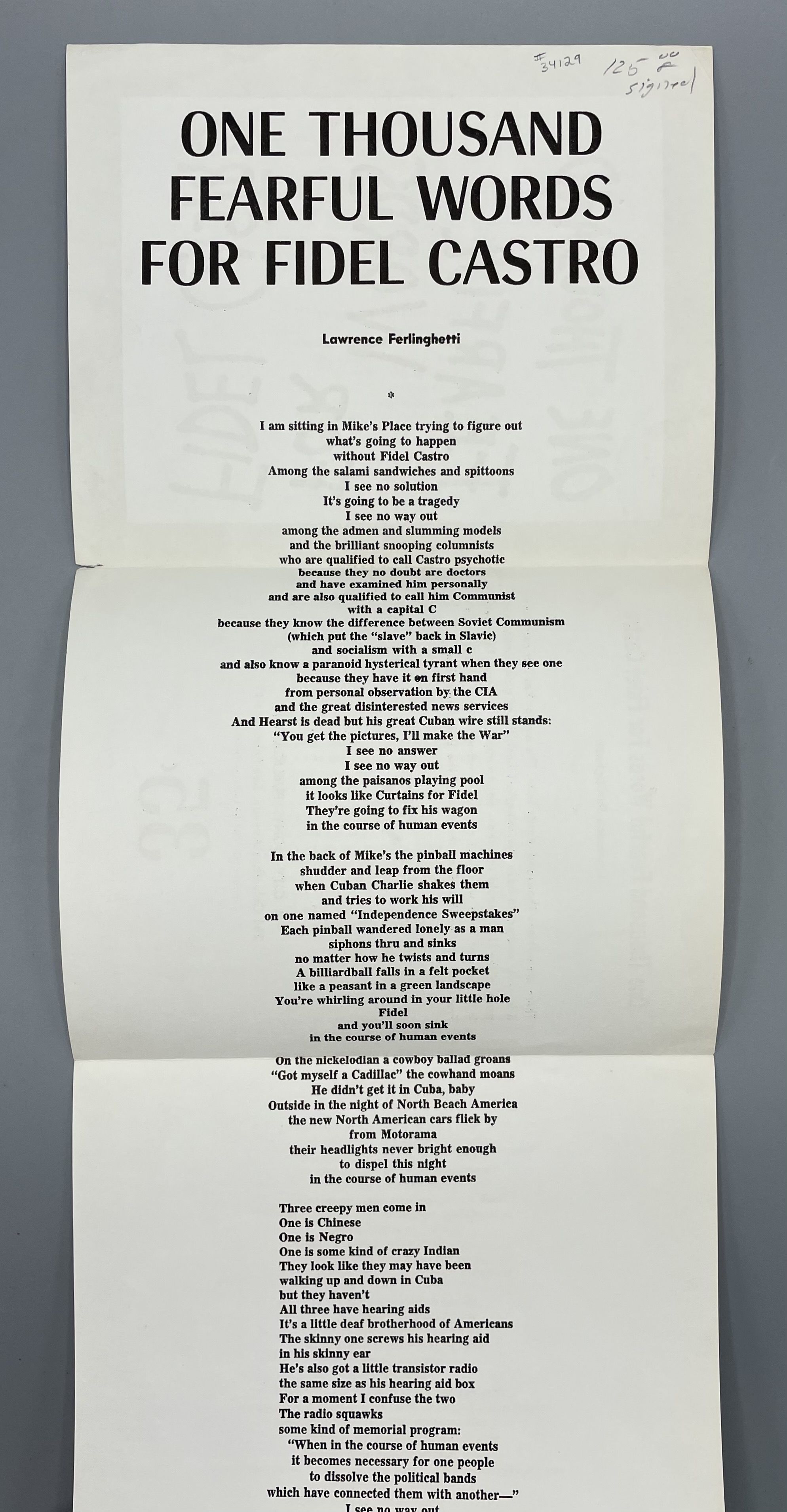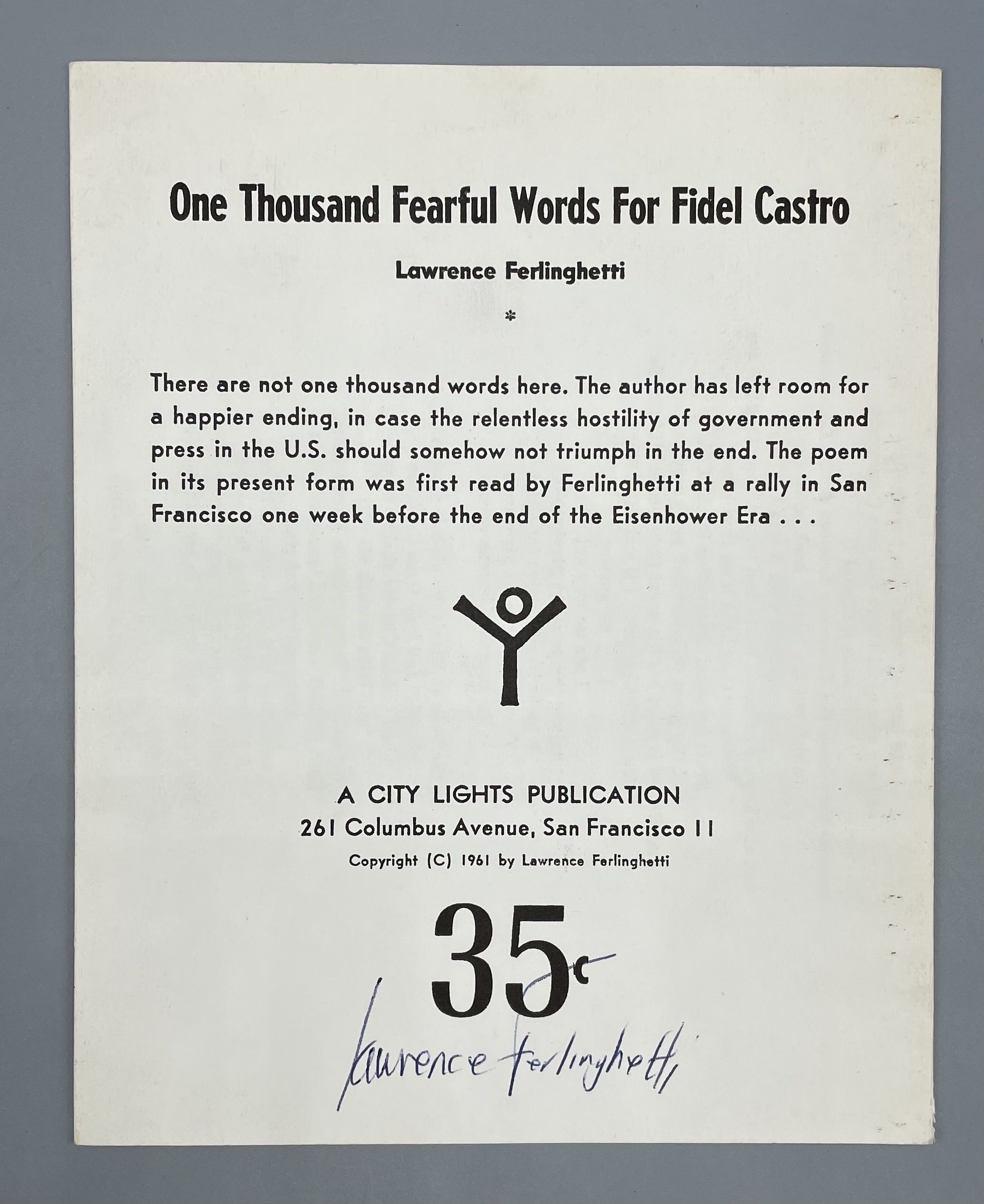 San Francisco: A City Lights Publication, 1961. Broadside. SIGNED. Thin duodecimo [19 cm] Folded black and white printed broadside poem. Very good. The extremities are ever so slightly creased, rubbed and soiled. There is a 1/4 inch long closed tear along one of the folds. Signed by Ferlinghetti on the rear wrap below the price. Lawrence Ferlinghetti is an American poet, painter, and liberal activist. He is the co-founder of City Lights Booksellers & Publishers.