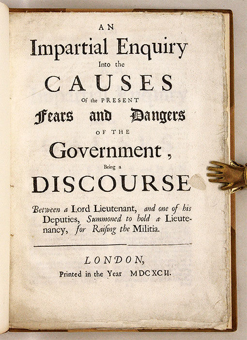 1692. London, 1692. 1st ed. London, 1692. 1st ed. Advice to King William and Queen Mary Booth, Henry, Earl of Warrington [1652-1694], Attributed. An Impartial Enquiry Into the Causes of the Present Fears and Dangers of the Government, Being a Discourse Between a Lord Lieutenant, And One of his Deputies, Summoned to Hold a Lieutenancy, For Raising the Militia. London: S.n., 1692. [ii], 20 (i.e. 18) pp. Text in parallel columns. Quarto (9" x 6"). Stab-stitched pamphlet bound into recent three-quarter calf over cloth, gilt title to spine, endpapers renewed. Light rubbing to extremities, front hinge starting. Some soiling to title page, interior otherwise fresh. $200. * First edition. Support for the Protestant monarchs in the form of sage military advice: a warning to pursue naval power rather than a land war in the struggle with France. It is also an expose of treacherous advice given to the king by French sympathizers. English Short-Title Catalogue R34927.