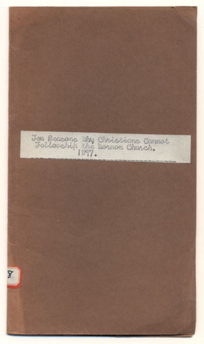 [Salt Lake City]: [Kinsman Publishing Co.], 1898. Third edition. Paperback. 8pp. Very thin duodecimo [20 cm] Tract glued between amateur plain brown wraps, with a simple paper title label mounted to the front wrap. Good. The plain wraps have areas of sun fading. There is a numerical paper label across the fold of the spine. The pages are browned and lightly creased. The pages are a little loose. The corners of the pages are slightly dog eared. There is a small loss from the top edge of the first page. A couple of the pages have minor stains. Done by order of the Presbytery of Utah, April 8, 1897. Flake 6744.