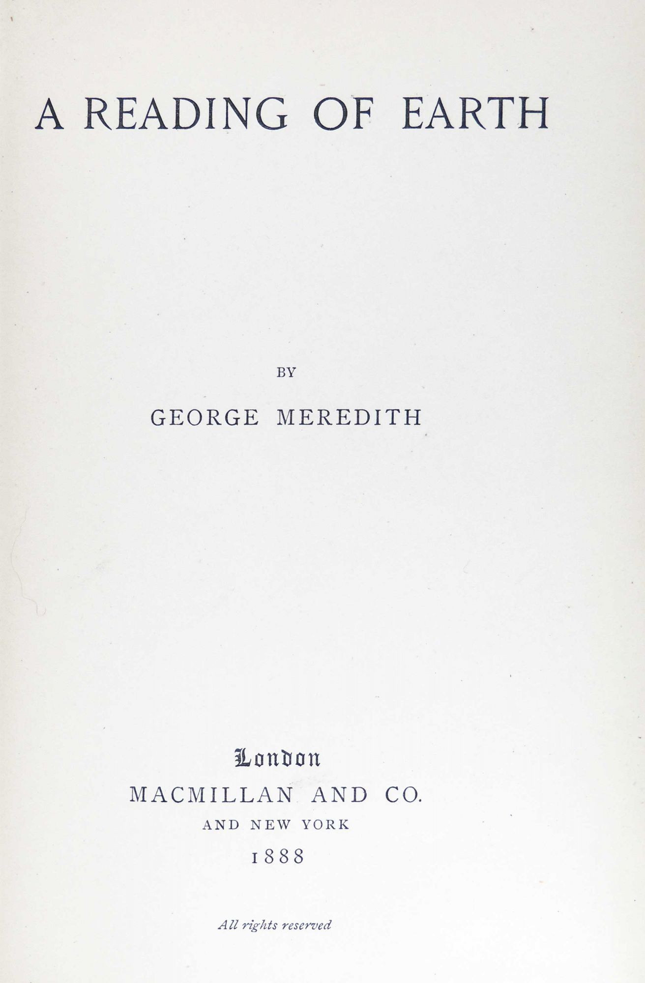 London: Macmillan and Co, 1888. Hardcover. Very Good. Hardcover. First Edition. Apparently a presentation copy, with an inserted sheet printed "From the Author" and with the bookplate of the recipient, G.W. Foote. Foote, a friend of Meredith's, was a British secularist and journal editor. In the original dark blue cloth with light bumping to corners. Interior page very good with light aging to margins and occasional pencil mark next to a passage. The inserted sheet has a browned crease along the top edge. In very good condition. 136 pages. POE/020113.