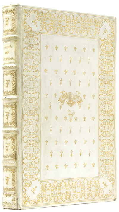 Paris: A. Barraud, 1878. No. 8 of 258 (of 260) copies on papier vergé fort. 17 plates (16 hand-colored and heightened in gold), half-title and title printed in red and black. [i-ii], xix, [i], 259, [1], [iv] pp. 8vo. Contemporary vellum by Ch. & L. Hilaire, covers stamped in gilt with wide border of arabesque tools with initial “F” at each corner, surrounding a central panel with a semé of fleur-de-lys and ermine-tail tools, the upper cover with a large initial “F” surmounted by a King’s helm with mantling, spine in six compartments with raised bands, titled in the second, the rest with repeat tooling of a decorative border surrounding an initial “F,” gilt turn-ins, cream moiré paper pastedowns and free endpapers, gilt and gauffered top edge, original wrappers bound-in. No. 8 of 258 (of 260) copies on papier vergé fort. 17 plates (16 hand-colored and heightened in gold), half-title and title printed in red and black. [i-ii], xix, [i], 259, [1], [iv] pp. 8vo. First edition under this title, and the first to include the plates. The first appearance of Prost’s text was with the title “Traités du duel judiciaire,” published in 1872 by Léon Willem in an edition limited to 400 copies. For the present edition publisher Barraud changed the title and added 16 colored plates, adapted from ms 2692 in the French Bibliothèque Nationale (“Portraicts du tournoi de Monseigneur de Gruthuse appelant, et de Monseigneur de Ghistelle deffendant”). The binding is possibly a pastiche of a binding done for François I.
