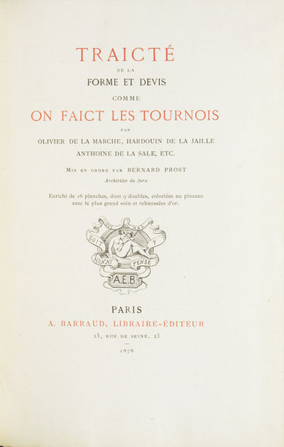 Traicté de la Forme et Devis Comme on Faict les Tournois par Olivier de la Marche, Hardouin de la Jaille, Anthoine de la Sale etc. Mis en Ordre par Bernard Prost Enrichi de 16 Planches, Dont 9 Doubles Coloriées au Pinceau Avec le Plus Grand Soin et Rehausées d’Or