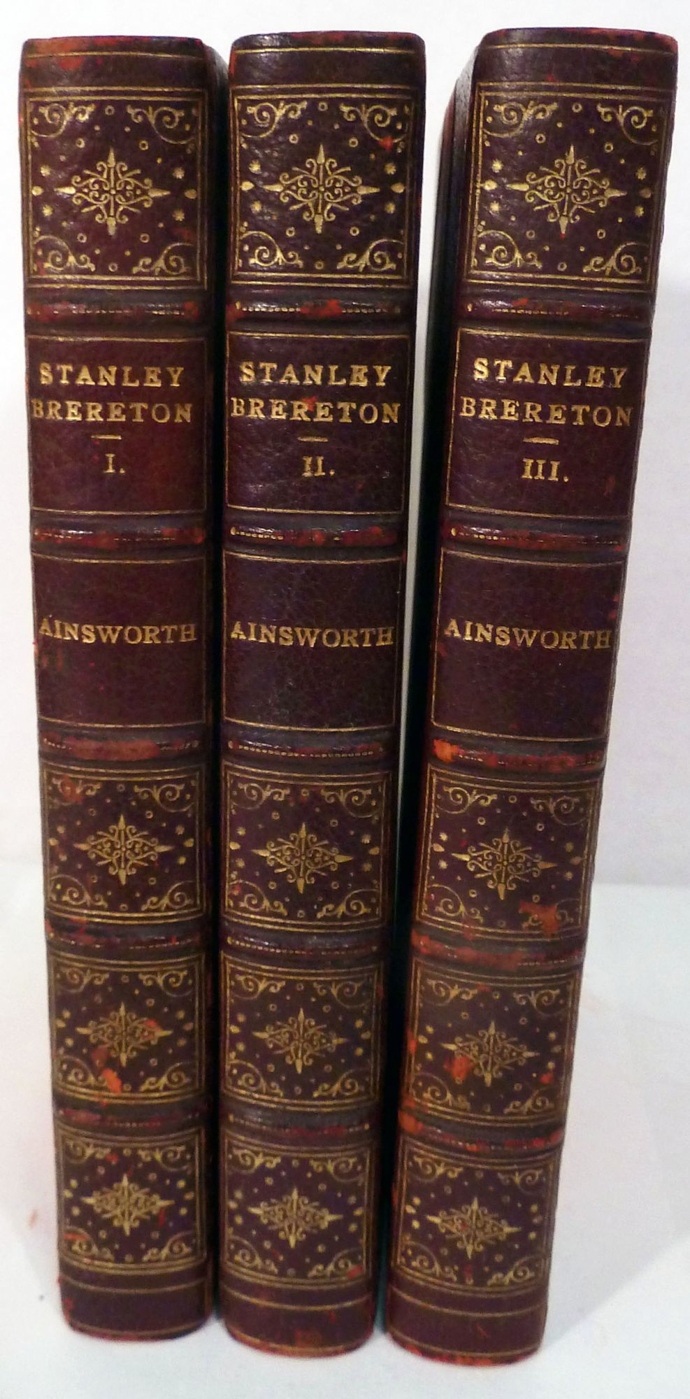 London: George Routledge, 1881. First edition. Hardcover. Three quarter maroon morocco and red cloth. Teg. Very good. 3 vols. 252, 277, 290 pages. 19 x 13 cm. This is Ainsworth's last novel. He was an English historical novelist born in Manchester. Popular in his lifetime, his novels sold in large numbers. he is described by S.M. Ellis as one of the most picturesque personalities of the nineteenth century. Prefaced to the first volume is Ainsworth's long account of the testimonial banquet given to him at Manchester Town Hall in September 1881, which is described by Wolff as useful for any account of his life and work. This last novel not in SADLEIR. Slight rubbing to extremities, raised bands, spine panels decorated in gilt, marbled endpapers.