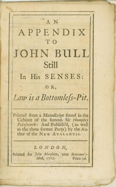 An Appendix to John Bull Still in his Senses: or, Law is a Bottomless Pit. Printed from a manuscript found in the cabinet of the famous Sir Humphry Polesworth: and publish'd, (as well as the three former parts) by the author of the New Atalantis
