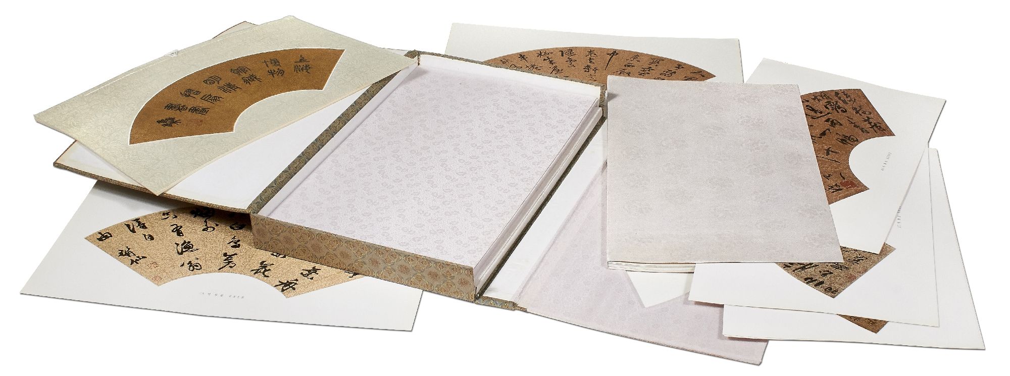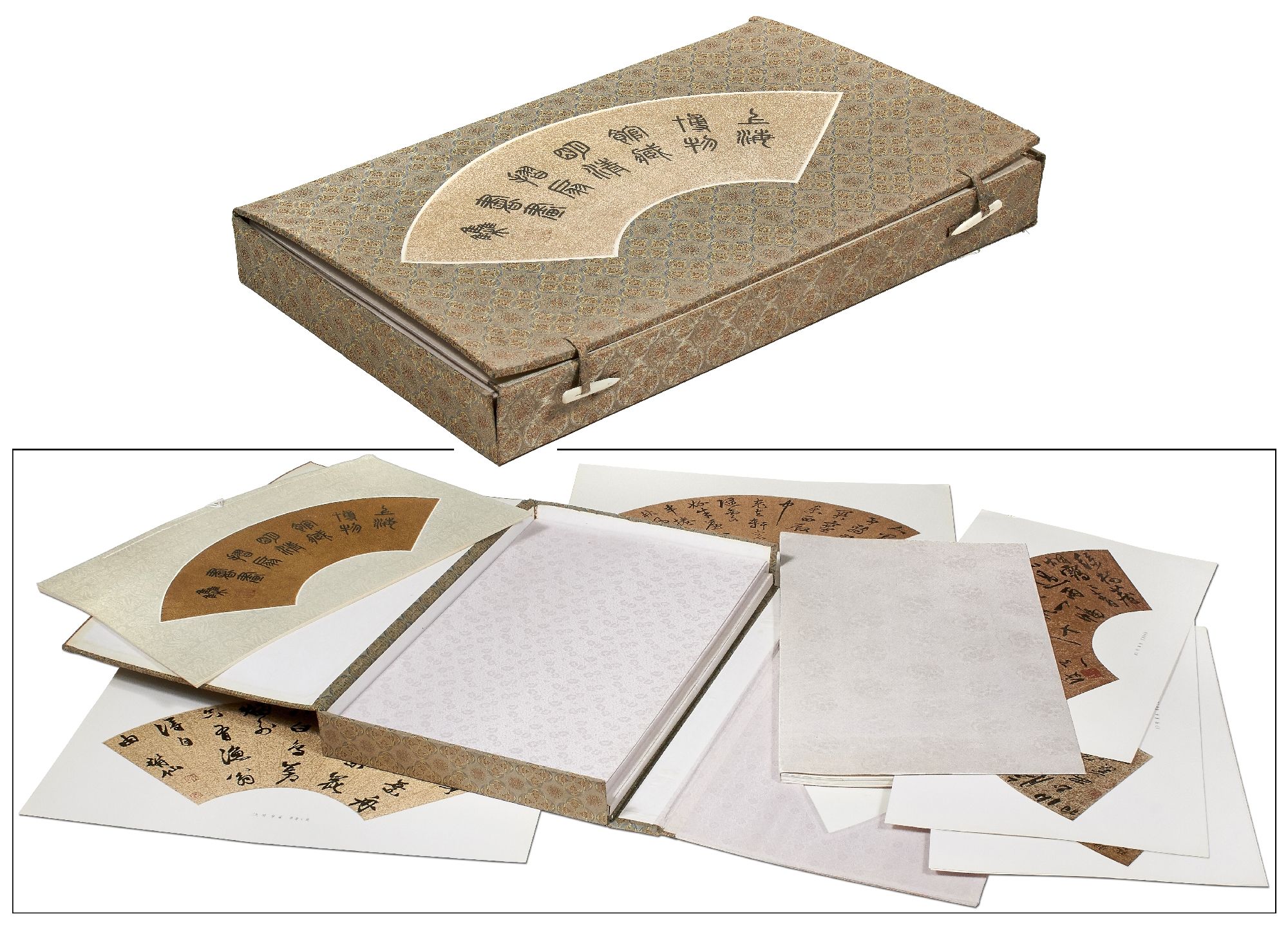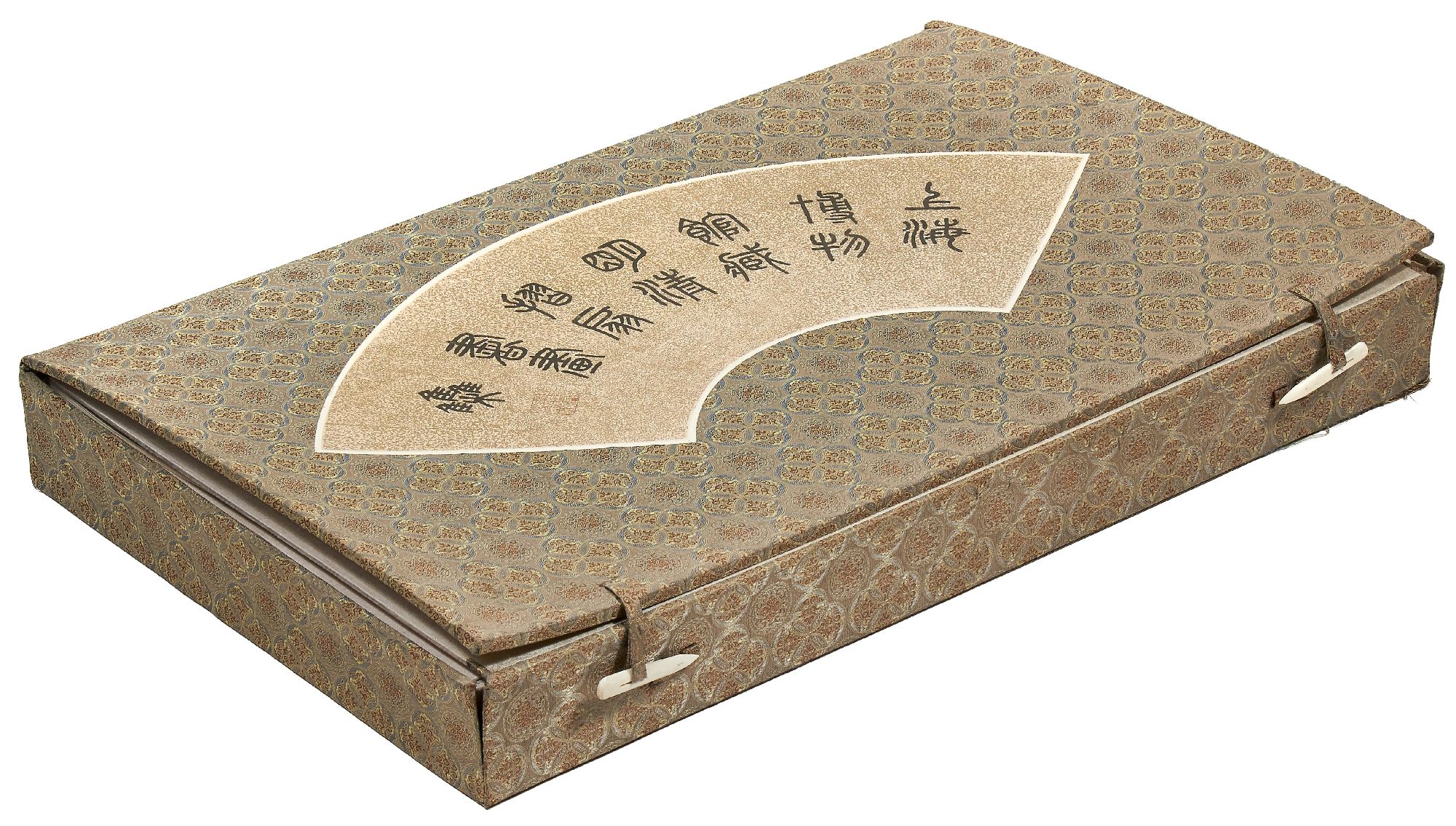 [Shanghai]: [Shanghai Museum], 1983. Softcover. Near Fine. First edition. Large oblong portfolio. Text in Chinese and English. Translated by Yang Liyi. Silk brocade box with two ivory fasteners. Contains the text in illustrated stitched wrappers: [4], 18pp. (Chinese); [3], 39, [1]pp. (English), and 150 color plates housed in three silk brocade slipcases. The box lid is a little bowed at both side edges, the corners are partially split, else very good, the internal stitched text and plates are near fine. A beautifully printed collection of plates, complete as issued in the original portfolio.