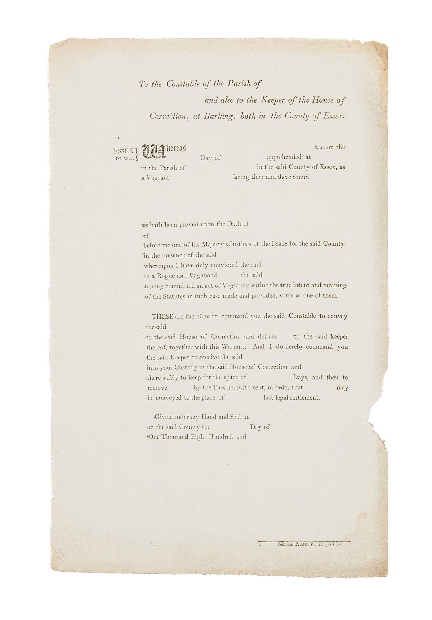 1800. Document for the Conveyance of Vagrants [Poor Law]. [Great Britain]. To The Constable of the Parish of _____ And also to the Keeper of the House of Correcetion, At Barking, Both in the County of Essex. [London]: Johnson, Printer, Whitechapel Rd., [c. 1800-1810]. 1 leaf. Folio (13-1/2" x 8-1/2"). Light soiling, some browning to margins, chip to fore-edge. $20. * Partly printed blank document for conveying "vagrants" to overseers of the poor. Blank forms such as these are interesting and scarce survivals that provide insight into their production and use.
