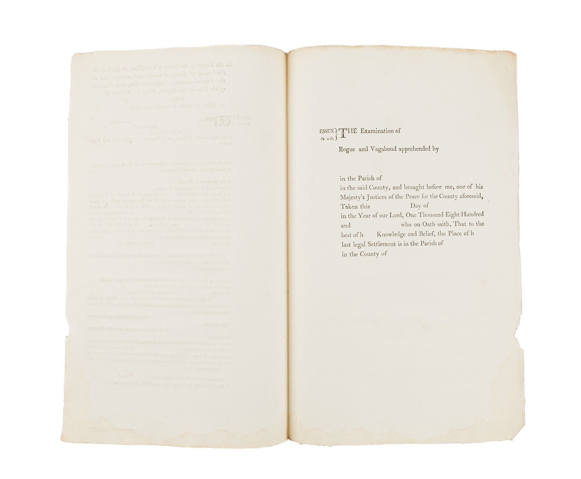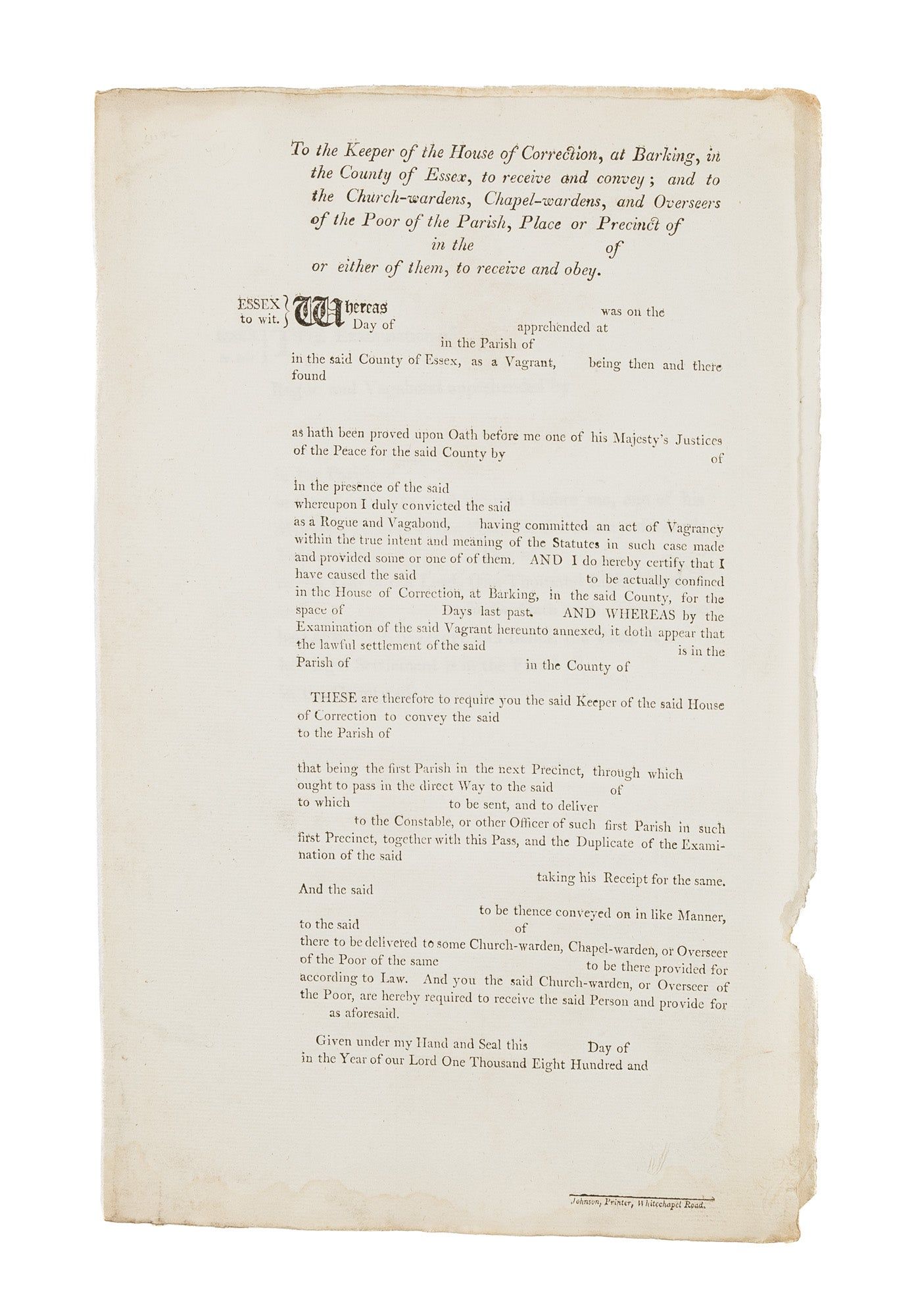 1800. [Poor Law]. [Great Britain]. To The Keeper of the House of Correction, At Barking, In the County of Essex, To Receive and Convey; And to the Church-Wardens, Chapel-Wardens, And Overseers of the Poor of the Parish, Place or Precinct of _____ in the _____ of _____ or Either of Them, To receive and Obey. [London]: Johnson, Printer, Whitechapel Rd., [c. 1800-1810]. 4 pp. Folio (13-1/2" x 8-1/2"). Light soiling, some toning and faint dampstaining to margins, small chip to fore-edge. $25. * Partly printed two-part blank document for conveying "vagrants" to overseers of the poor. Blank forms such as these are interesting and scarce survivals that provide insight into their production and use.