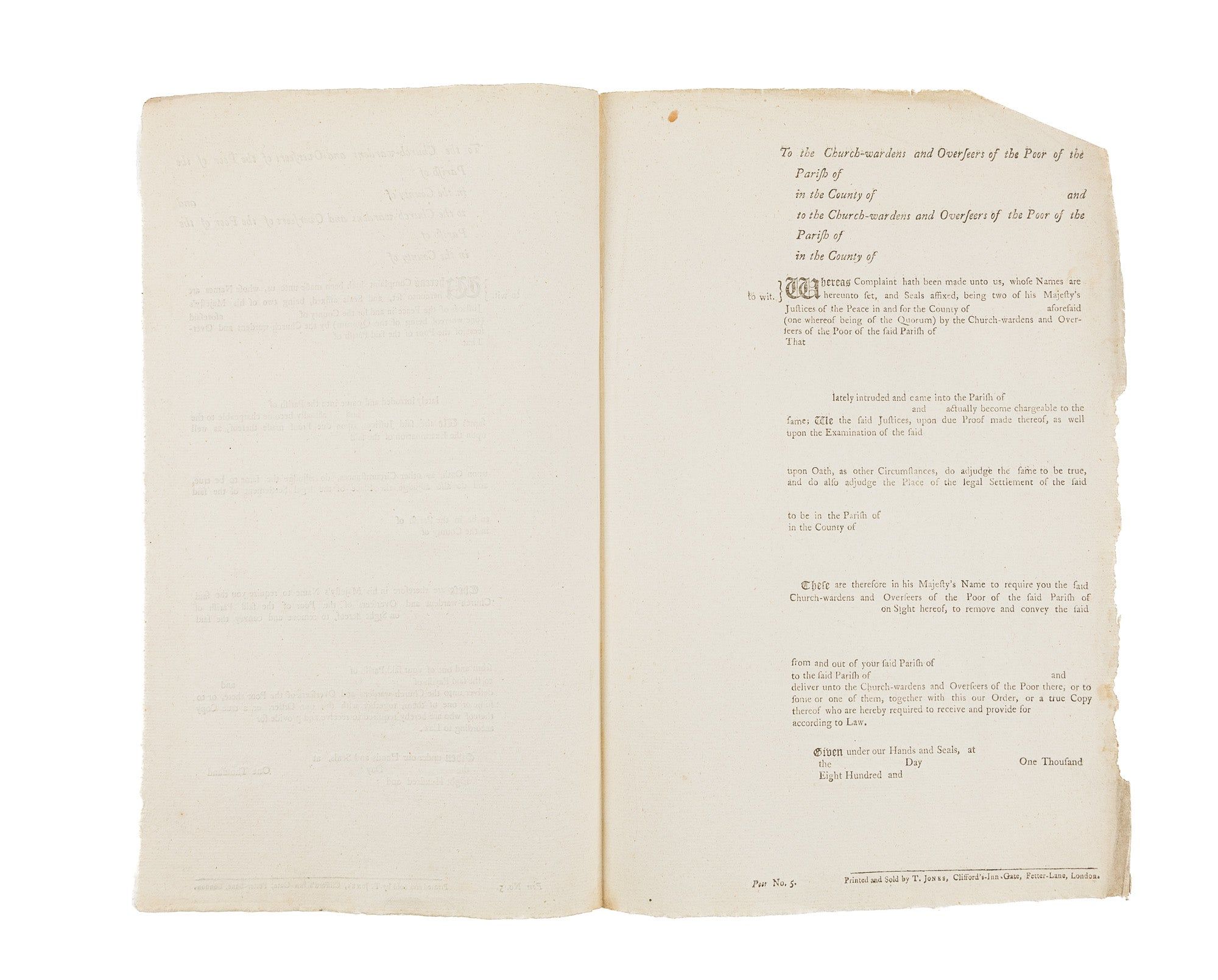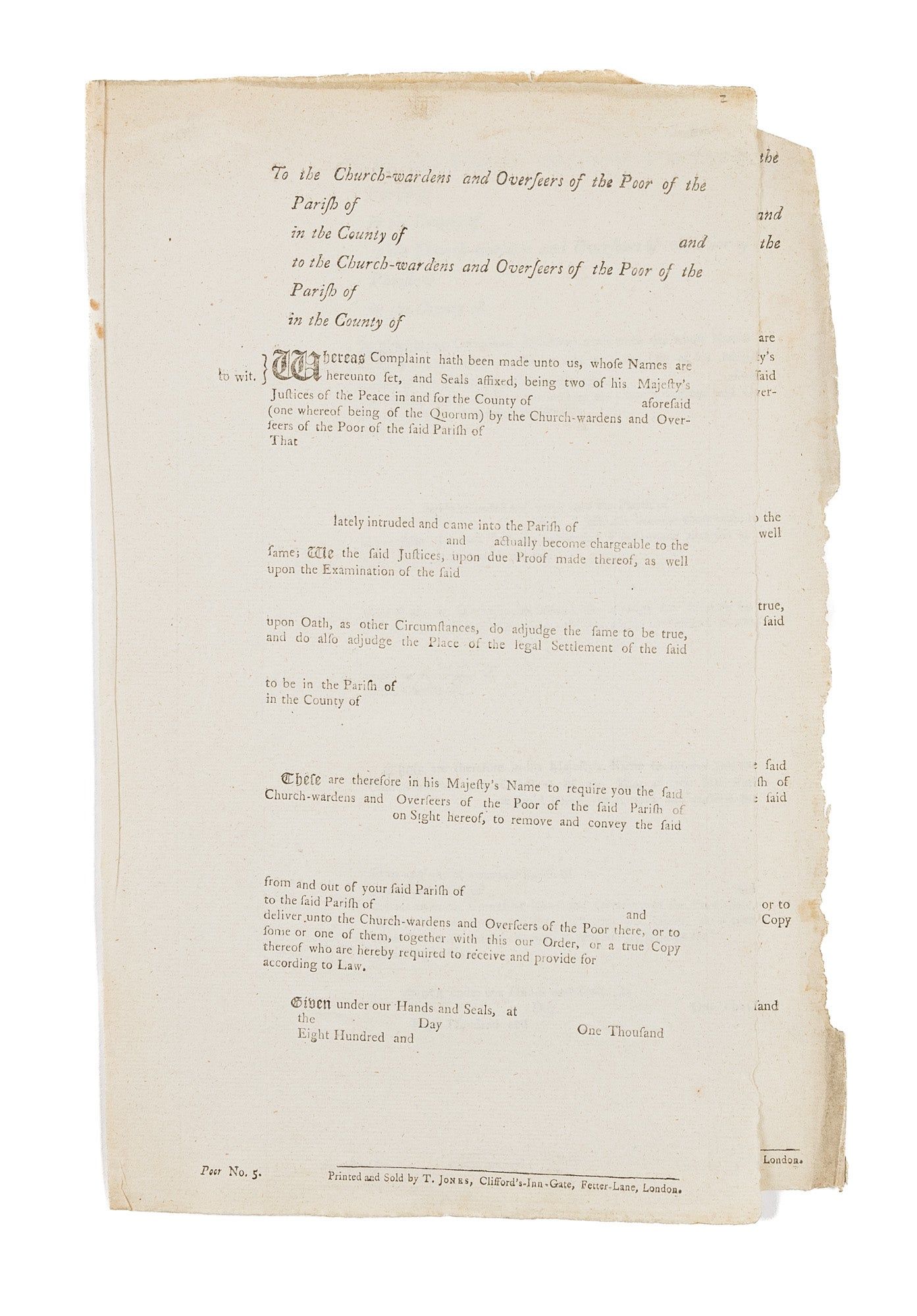 1800. [Poor Law]. [Great Britain]. To The Church-Wardens and Overseers of the Poor of the Parish of _____ in the County of _____ and to the Church-Wardens and Overseers of the Poor of the Parish of _____ in the County of _____. London: Printed and Sold by T. Jones, c. 1800-1810. 4 pp. Folio (13-1/2" x 8-1/2"). Light soiling, some toning and edgewear to margins. $25. * Used by justices of the peace, this is a partly printed warrant for the removal of poor people who intrude upon a parish where they are not chargeable to a place of legal settlement. Blank forms such as these are interesting and scarce survivals that provide insight into their production and use.