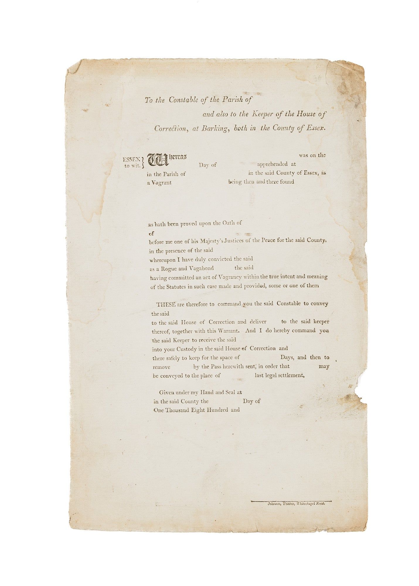 1800. [Poor Law]. [Great Britain]. To The Constable of the Parish of _____ And also to the Keeper of the House of Correcetion, At Barking, Both in the County of Essex. [London]: Johnson, Printer, Whitechapel Rd., [c. 1800-1810]. 1 leaf. Folio (13-1/2" x 8-1/2"). Some soiling, edgewear and dampstaining. $20. * Partly printed blank document for conveying "vagrants" to overseers of the poor. .