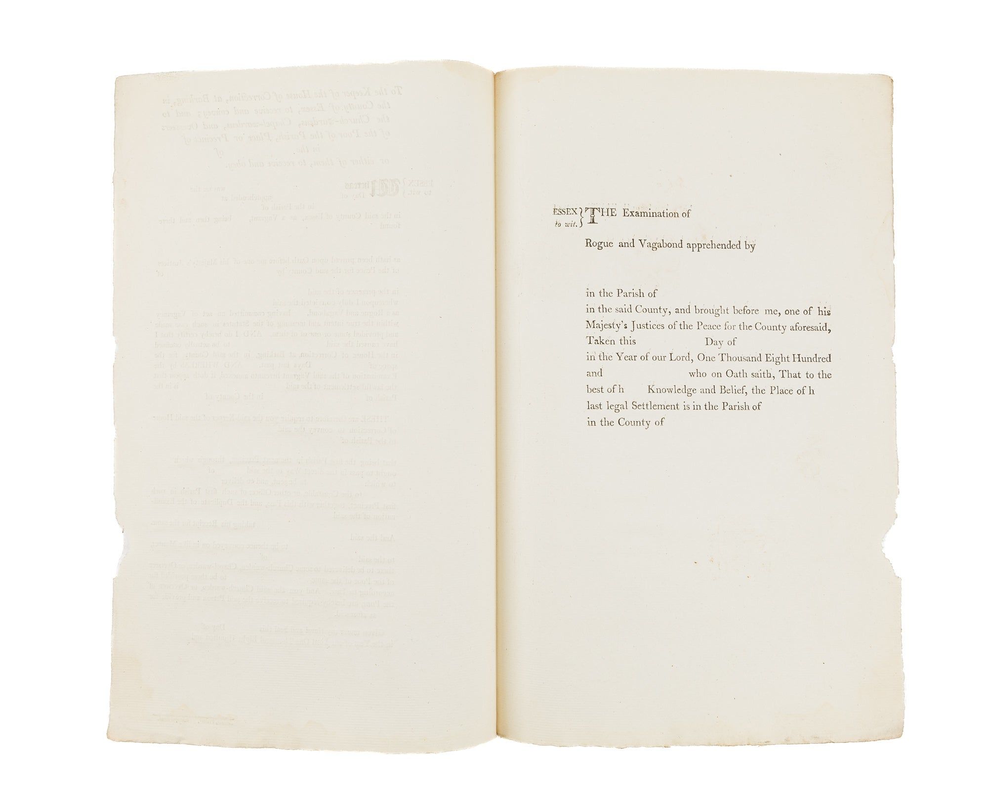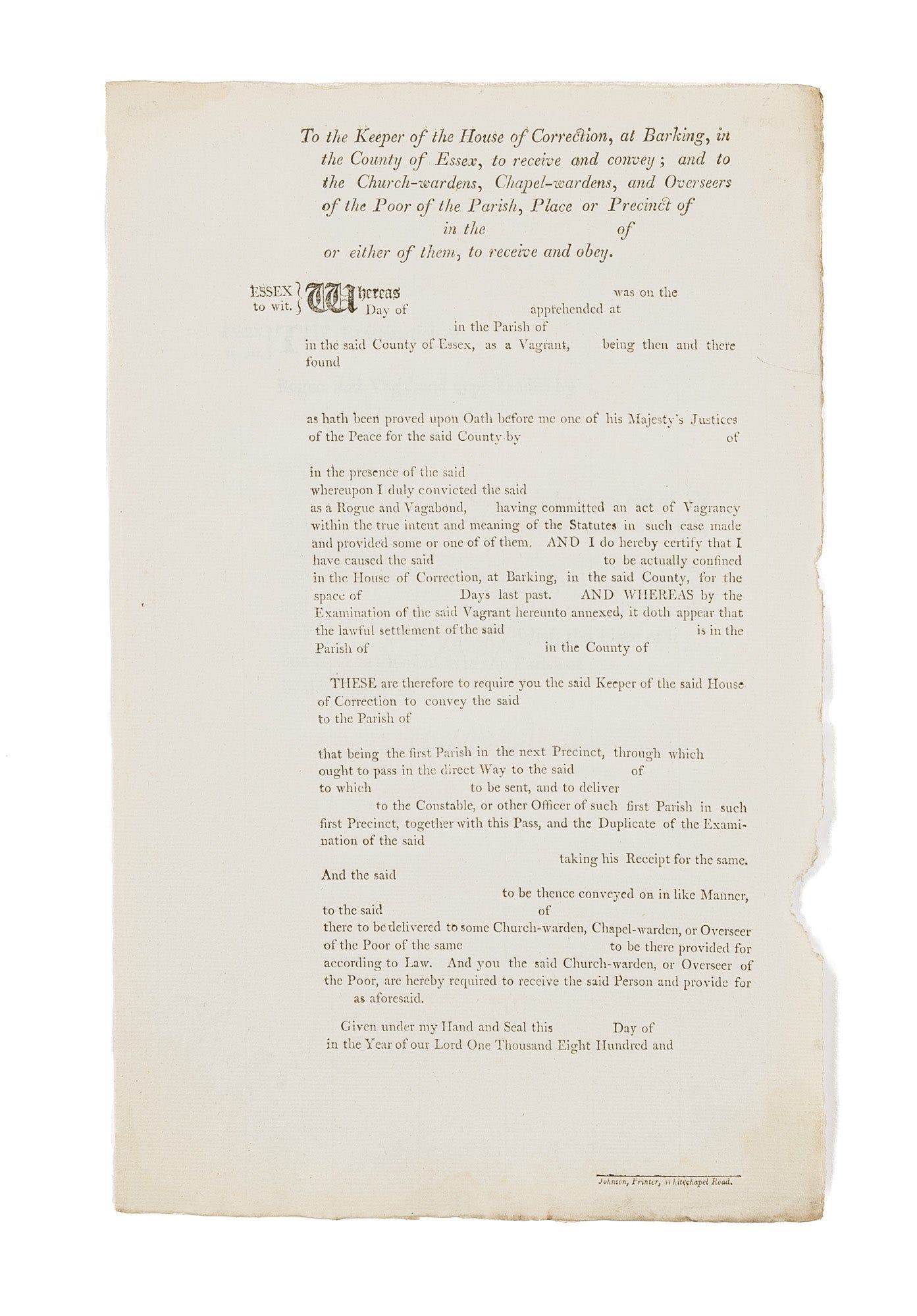 1800. [Poor Law]. [Great Britain]. To The Keeper of the House of Correction, At Barking, In the County of Essex, To Receive and Convey; And to the Church-Wardens, Chapel-Wardens, And Overseers of the Poor of the Parish, Place or Precinct of _____ in the _____ of _____ or Either of Them, To receive and Obey. [London]: Johnson, Printer, Whitechapel Rd., [c. 1800-1810]. 4 pp. Folio (13-1/2" x 8-1/2"). Light soiling, some toning and faint dampstaining to margins, small chip to fore-edge. $25. * Partly printed two-part blank document for conveying "vagrants" to overseers of the poor. Blank forms such as these are interesting and scarce survivals that provide insight into their production and use.