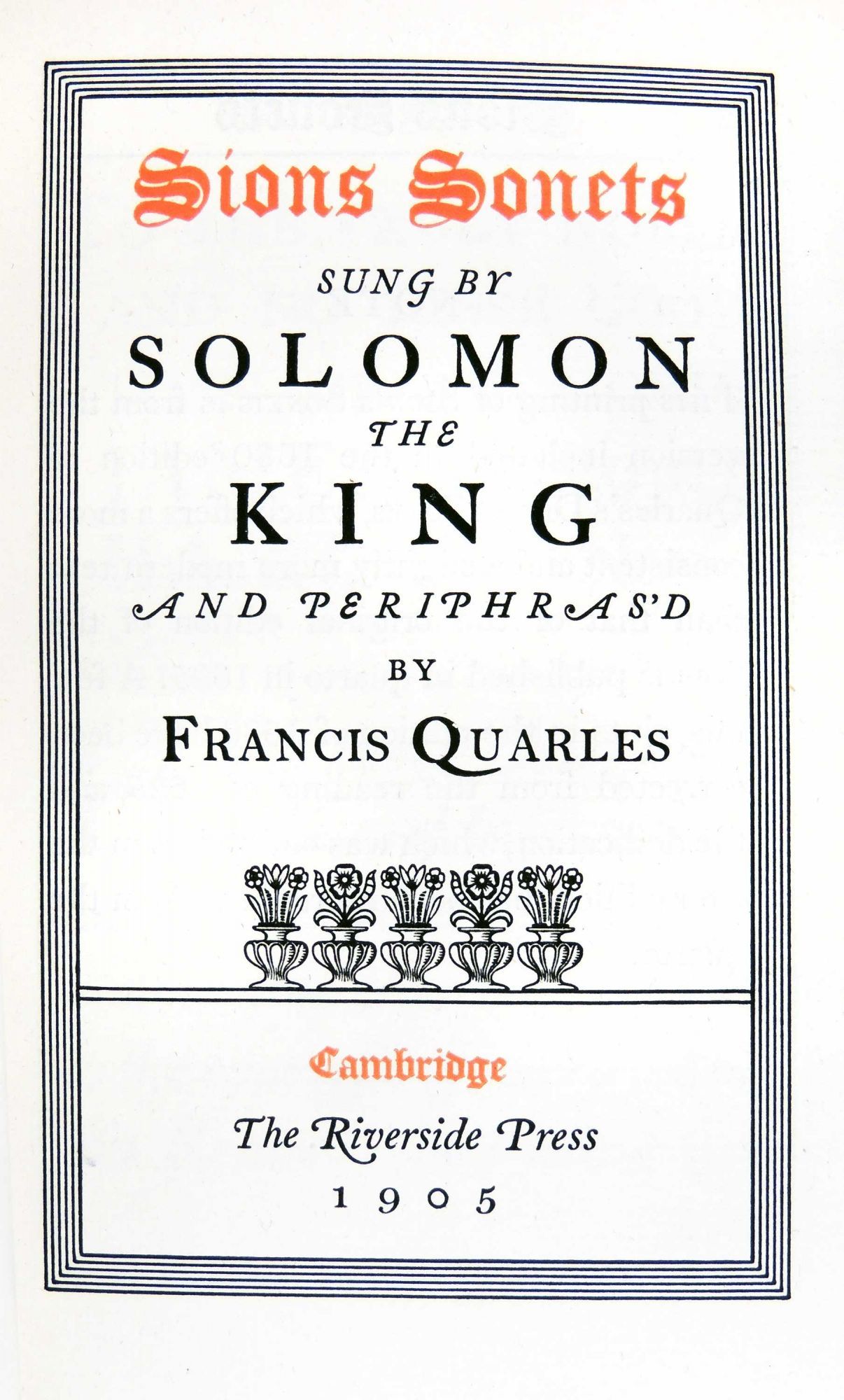Sions Sonets. Sung by Soloman the King and Periphras'd by Francis Quarles. [Song of Songs or Song of Soloman]
