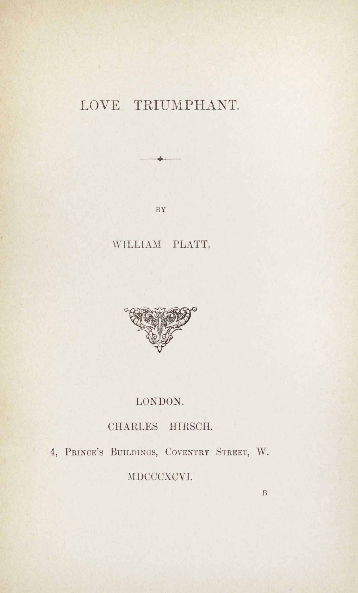 London: Charles Hirsch, 1896. Hardcover. Very Good. Hardcover. First Edition of an uncommon work. A curious book, it was one of two legitimate novels published by Charles Hirsch, a London bookseller and publisher known for distributing clandestine works. William Platt was a peculiar 1890s writer whose works concerned the role of the sexes and often leaned toward the risque. In keeping with this, the cover has an illustration in gilt of a nude woman reading a book. In original green cloth, somewhat rubbed and bumped. Interior pages have browning to margins, offsetting to free endpapers with chip to rear free endpaper. Still a nice copy in very good condition. 222 pages plus ad for music by William Platt and 16 pages of reviews of Platt's Men, Women, and Chance. LIT/032513.