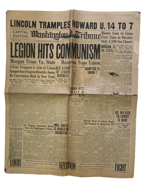 1935. Paperback. Poor. 8p. Eight-page newspaper. 46 x 56 cm. High acid newsprint chipped and browned. Fragile, Loss of a few words along folds. African American Newspaper published in Washington, DC by the Tribune Publishing Company. Biggest headline: Legion Hits Communism. One of the other front page, non-sports headlines: Borah hits NAACP in Vote Bid.