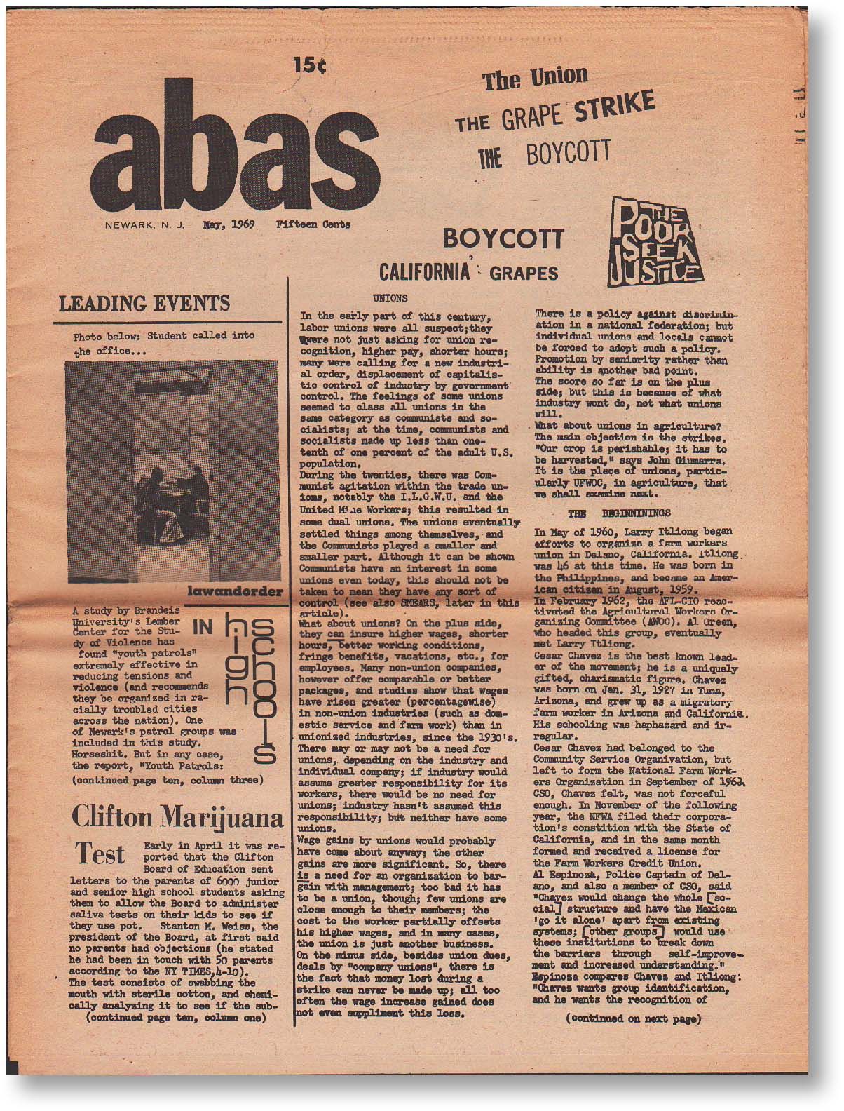 Newark: Abas Magazine, 1969. First Edition. Three issues. Tabloid; on newsprint; each issue 12pp. Horizontal mailing folds (as issued); mailing labels to front pages; text slightly toned - Good or better, and complete. Scarce, short-lived underground paper produced by a Newark, New Jersey high-school collective. Masthead of no. 7 suggests that it is the first issue to be produced by offset in tabloid format; earlier issues were (apparently) mimeographed and sold only by mail. The masthead indicates that Abas was the successor publication to a high-school underground mimeo sheet named Column,"suggesting that the paper's editor(s) were either still in or just out of high school when these issues of Abas were produced. Heavy on free UPI syndicated material; the original writing at a suitably low level to support the high school thesis. The paper appears (per OCLC) to have ceased publication after ten issues. Institutional holdings are scattered and meagre; none others in commerce (2013).