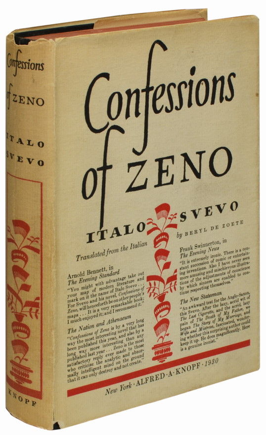 New York: Alfred A. Knopf, 1930. First American edition. Fine/Very Good +. A lovely copy of Svevo's best work, a novel that is widely regarded as the "great modern Italian novel." Book Fine with a touch of mottling to the cloth on the rear board, otherwise clean, fresh and unread. In a Very Good + price-clipped dust jacket with small chips at the spine ends and one corner, otherwise in a quite attractive state.