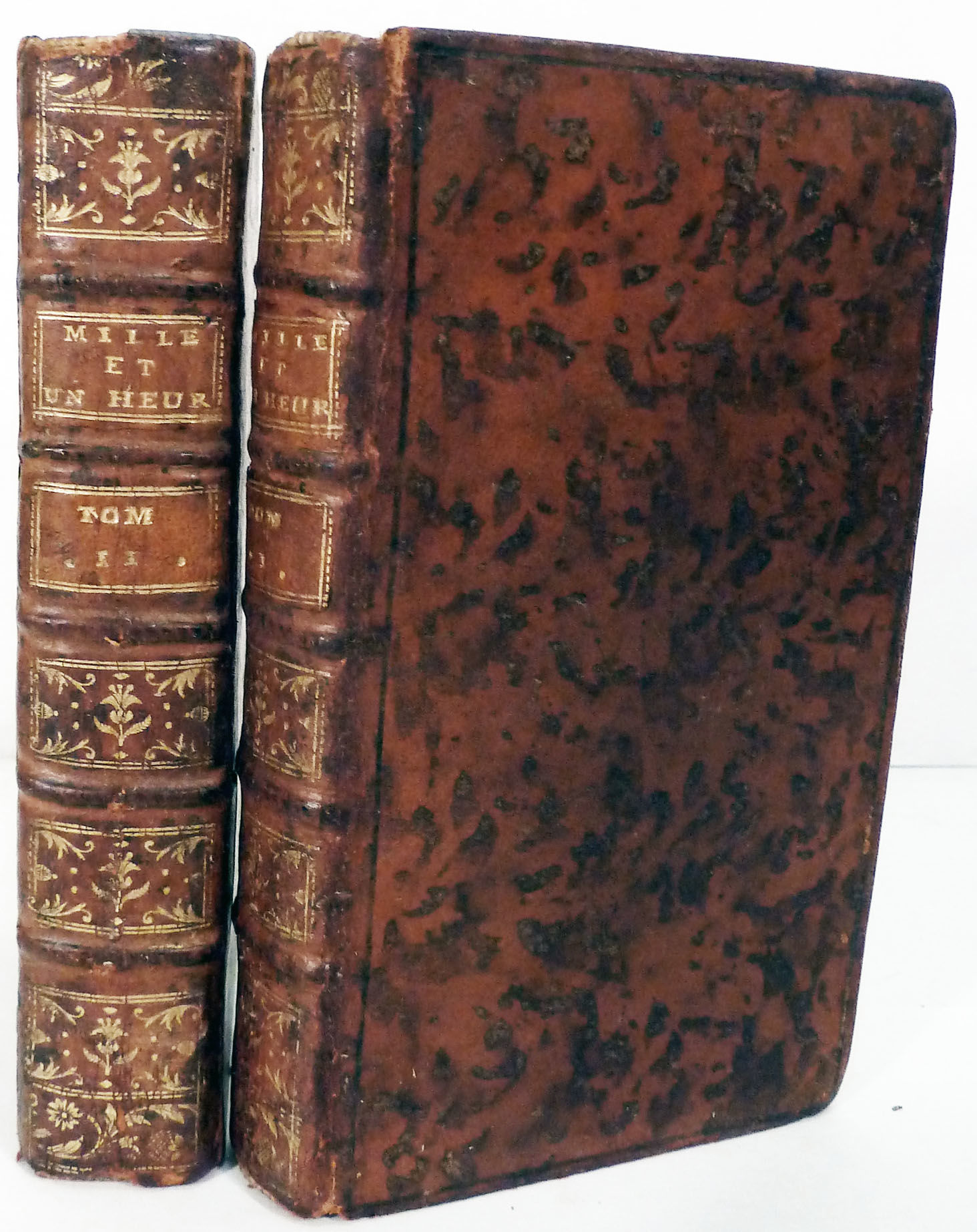 London: Nyon et al., 1759. Nouvelle Edition. leather_bound. Contemporary mottled brown calf. All edges marbled. Very good. 2 vols. 407, 490 pages. 17 x 10 cm. "Peruvian Tales, related, in One Thousand and One Hours, by one of the Select Virgins of Cusco, to the Yncka of Peru." Text in French. The author, a French magistrate and prolific writer of tales. PALAU 110068 & SABIN 29143 for the English editions. Raised bands, spine panels richly gilt, marbled endpapers, bookplates, modest tip rubbing, generally clean and fresh copy.