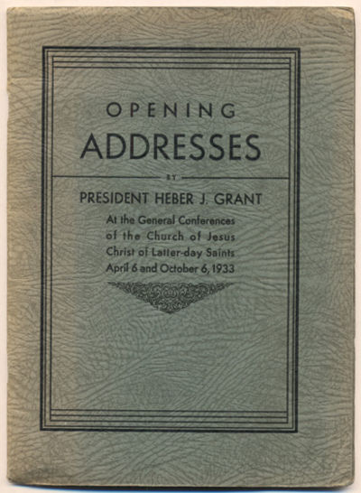 1933. Paperback. SIGNED. Thin duodecimo [19 cm] Stapled green and black printed wraps. Very good. The wraps have large areas of sun fading. Includes addresses concerning cigarettes and avoiding bankruptcy. Inscribed by Heber J. Grant on a folded presentation note that has mounted to the title page. Additionally inscribed by numerous Elders of the Church of Jesus Christ of Latter-Day Saints.