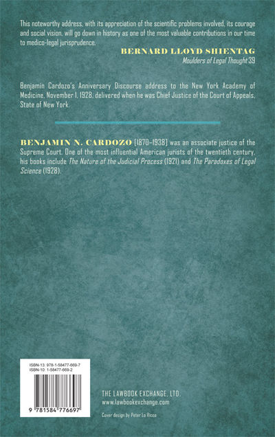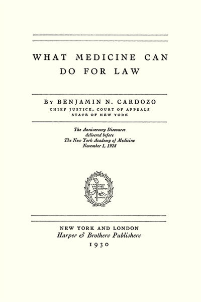 2014. ISBN-13: 9781584776697; ISBN-10: 1584776692. Cardozo, Benjamin N. What Medicine Can Do For Law. Originally published: New York: Harper & Brothers, 1930. 52 pp. Reprinted 2005, 2014 by The Lawbook Exchange, Ltd. ISBN-13: 9781584776697; ISBN-10: 1584776692. Hardcover. New. $27.95 * Reprint of the first edition. Cardozo [1870-1938], an Associate Justice of the Supreme Court, was one of the most influential American jurists of the twentieth century. "This noteworthy address, with its appreciation of the scientific problems involved, its courage and social vision, will go down in history as one of the most valuable contributions in our time to medico-legal jurisprudence.": Bernard L. Shientag, Moulders of Legal Thought 39.