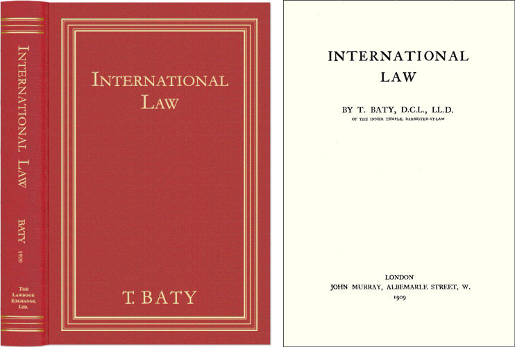 2005. ISBN-13: 9781584775638; ISBN-10: 1584775637. Baty, T[homas]. International Law. Originally published: London: John Murray, 1909. 364 pp. Reprinted 2005 by The Lawbook Exchange, Ltd. ISBN-13: 9781584775638. ISBN-10: 1584775637. Hardcover. New. $95. * Provides a thorough review of international incidents throughout nineteenth century Europe, the Near East and the Americas relating to arbitration, penetration, territorialism and similar subjects. He concludes that international law manifested in agreements among nations would be supplanted by a less rigid system governed by contracts. This will happen, he reasons, due to the greater economic interdependence of nations brought about by globalization. Anticipating the effects of 21st-century globalism, Baty concludes by outlining the ways this interdependence will occur, and some of its potential dangers. * Thomas Baty [1868-1954], an English lawyer, traitor and transgender pioneer, was one of the most intriguing individuals in the field of twentieth-century international law. A leading expert and prolific scholar who taught at Oxford University and was a joint secretary of the International Law Association, he secured his reputation with the publication of this work and War: Its Conduct and Legal Results (1915), a work co-written with John H. Morgan. At the same time he lived a parallel private life as Irene Clyde and helped to found, and was the editor of, Urania, the pioneering anti-gender magazine of the 1900s. In 1916 he became a legal advisor to the Japanese foreign ministry. His legal opinion did much to "justify" Japan's invasion of Manchuria in 1931. At the outbreak of war in 1939 he chose to remain in Japan and continued to advise the government even after Pearl Harbor and Japan's declaration of war against the U.S. and Britain. His last legal paper appeared in the English-language journal Contemporary Japan in 1944.