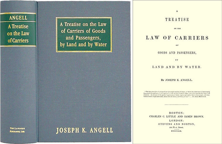 2003. ISBN-13: 9781584772927; ISBN-10: 1584772921. Angell, Joseph K. A Treatise on the Law of Carriers of Goods and Passengers, by Land and Water. Originally published: Boston: Charles C. Little and James Brown, 1849. xxiv, 791 pp. Reprinted 2003 by The Lawbook Exchange, Ltd. ISBN-13: 9781584772927; ISBN-10: 1584772921. Cloth. Hardcover. New. $95. * The first legal treatise on the subject of railroads. Angell [1794-1857] was a Boston attorney and one of America's first significant legal scholars. A prolific author, he published treatises on the law of corporations, watercourses and other topics. His works were esteemed highly and Angell on Carriers viewed as one of his finest treatises. James Kent said they were indispensable to the intelligent lawyer (DAB); several were required reading at Harvard Law School. With an appendix of adjudged cases, acts of Congress "for the safety of passengers on board of steam-boats" and an addenda of decisions "not published in season to be inserted in the body of the work." Dictionary of National Biography I:310. See Warren, A History of the American Bar 546.
