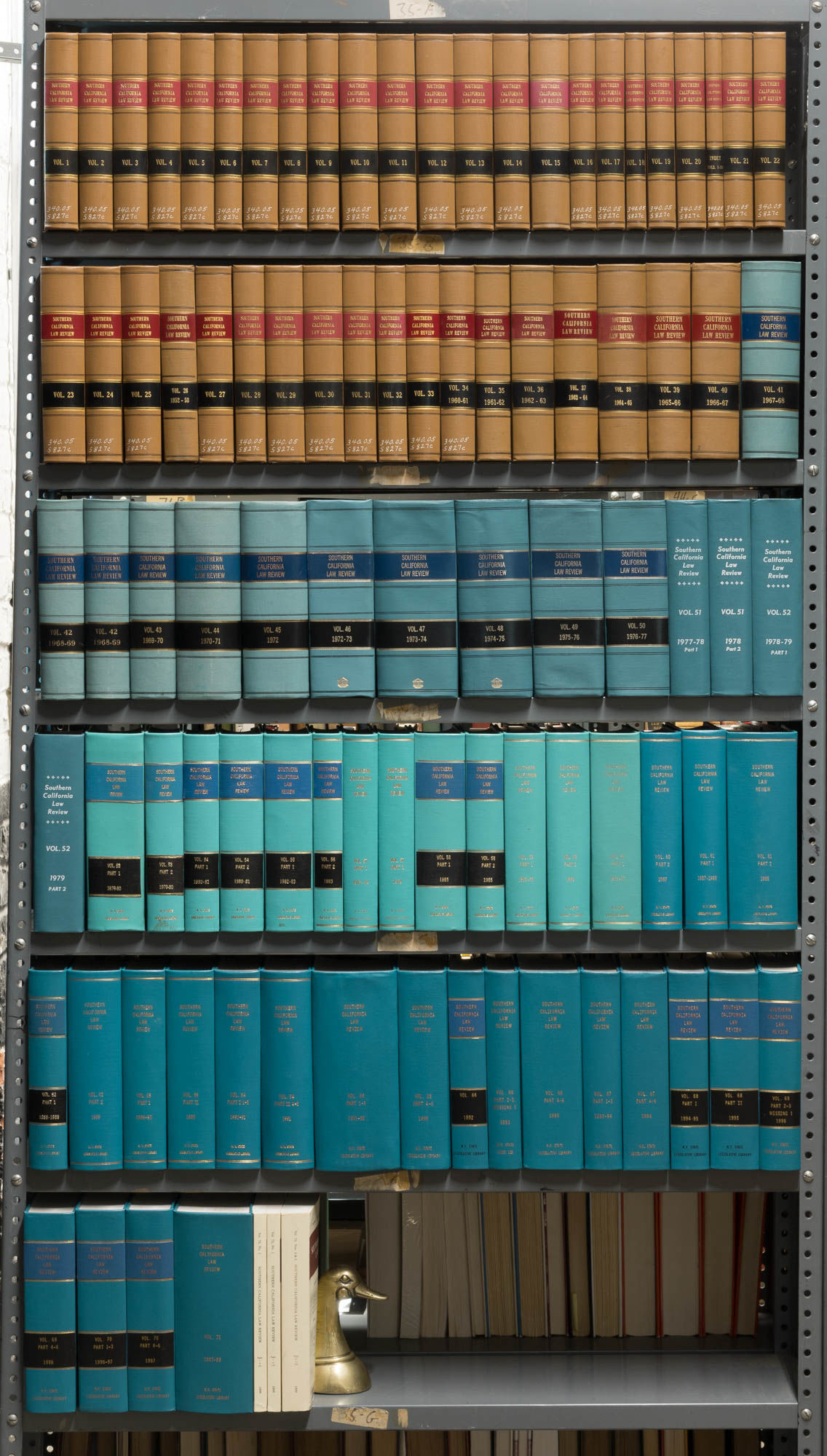 1998. Missing Vol. 55. Missing Vol. 55. Southern California Law Review. Los Angeles: USC Law Center. Vols. 1 to 71. (1927-1998). Hardcover. Cloth, various bindings, ex-library. Vols. 1-40 with small white library shelf location numbers at foot of spine. Eighteen (18) linear feet of shelf space. Special $495.