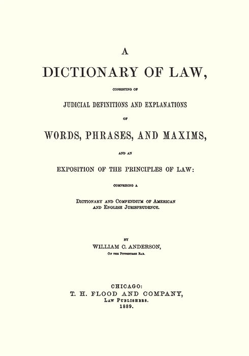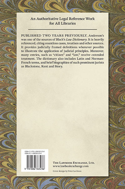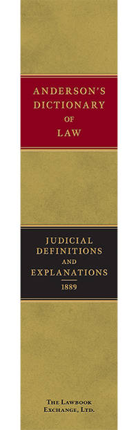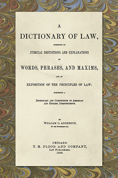 5201. ISBN-13: 9781886363236; ISBN-10: 1886363234. Anderson, William C. A Dictionary of Law, Consisting of Judicial Definitions and Explanations of Words, Phrases, and Maxims, and an Exposition of the Principles of Law: Comprising a Dictionary and Compendium of American and English Jurisprudence. Originally published: Chicago: T.H. Flood and Company, 1889. viii, 1140 pp. Reprinted 1996, 2019 by The Lawbook Exchange, Ltd. ISBN-13: 9781886363236; ISBN-10: 1886363234. Hardcover. New. $195. * An authoritative legal reference work for all libraries. Published two years previously, Anderson's was one of the sources of Black's Law Dictionary. It is heavily referenced, citing countless cases, treatises and other sources. It provides judicially framed definitions whenever possible to illustrate the application of judicial principles. Moreover, many entries such as "citizen" and "law" receive extended treatment. The dictionary also includes Latin and Norman-French terms, and brief biographies of prominent jurists such as Blackstone, Kent, and Story.