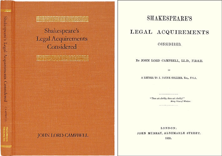 2001. ISBN-13: 9781584771265; ISBN-10: 1584771267. Originated the Supposition that Shakespeare Had a Legal Background Campbell, Baron John. Shakespeare's Legal Acquirements Considered. Originally published: London: John Murray, 1859. vi, 117 pp. Reprinted 2001 by The Lawbook Exchange, Ltd. ISBN-13: 9781584771265; ISBN-10: 1584771267. Hardcover. New. $23.95 * Reprint of first edition. Campbell's treatise on the law as found in the literature of Shakespeare is from a letter to J. Payne Collier but is here organized into chapters by play title. He also examines Shakespeare's sonnets and his will from a legal viewpoint. "In this essay he collected all of the clear and unmistakable legal phrases, terms, and allusions scattered through Shakespeare's plays; arranged and compared them; and came to the conclusion that they furnished unequivocal evidence that Shakespeare possessed that amount of legal knowledge, and especially that acquaintance with the most common legal terms and technical phrases, which would naturally be acquired by an intelligent and observing clerk in the office of a practicing attorney." 3 West Coast Reporter 581 1884. See Holdsworth, A History of English Law 15: 415.