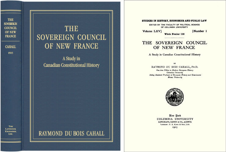 2005. ISBN-13: 9781584774679; ISBN-10: 1584774673. Cahall, Raymond Du Bois. The Sovereign Council of New France: A Study in Canadian Constitutional History. Originally published: New York: Columbia University Press, 1915. 274 pp. Reprinted 2005 by The Lawbook Exchange, Ltd. ISBN-13: 9781584774679; ISBN-10: 1584774673. Hardcover. New. $29.95 * The Sovereign Council was a governmental body established by France in 1663 to administer its colony in the St. Lawrence Valley. Unusually powerful for a colonial government, the council was the primary legislative and legal authority of New France. It had the power to select judges and minor officials, control public funds and commerce with the mother country, regulate the fur trade and set policy on local affairs. Cahall treats the council's history, organization, procedure and functions, assesses its effectiveness and evaluates its achievements and failures. This valuable study was originally published as Volume LXV, Number 1 in Columbia's series Studies in History, Economics and Public Law.