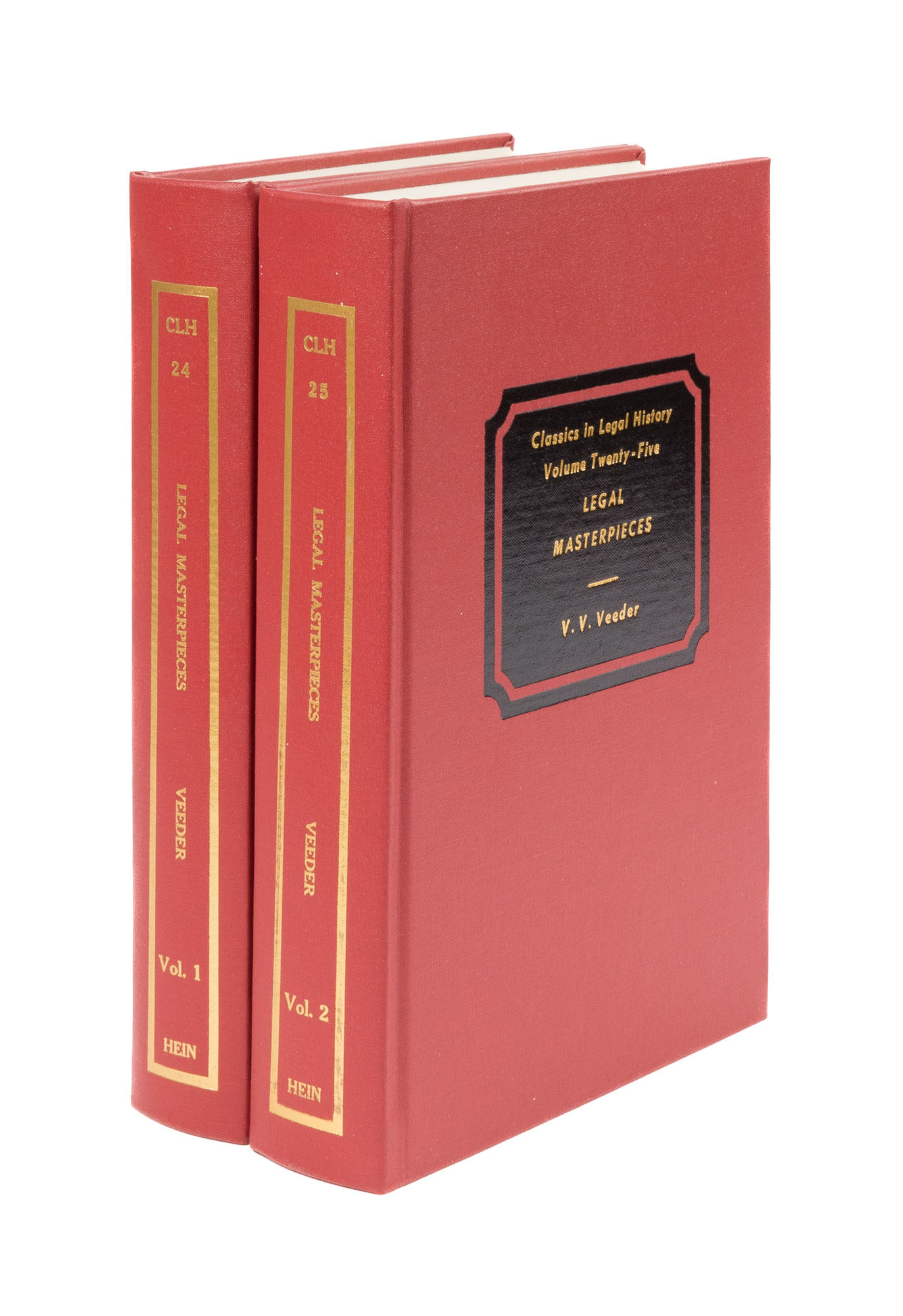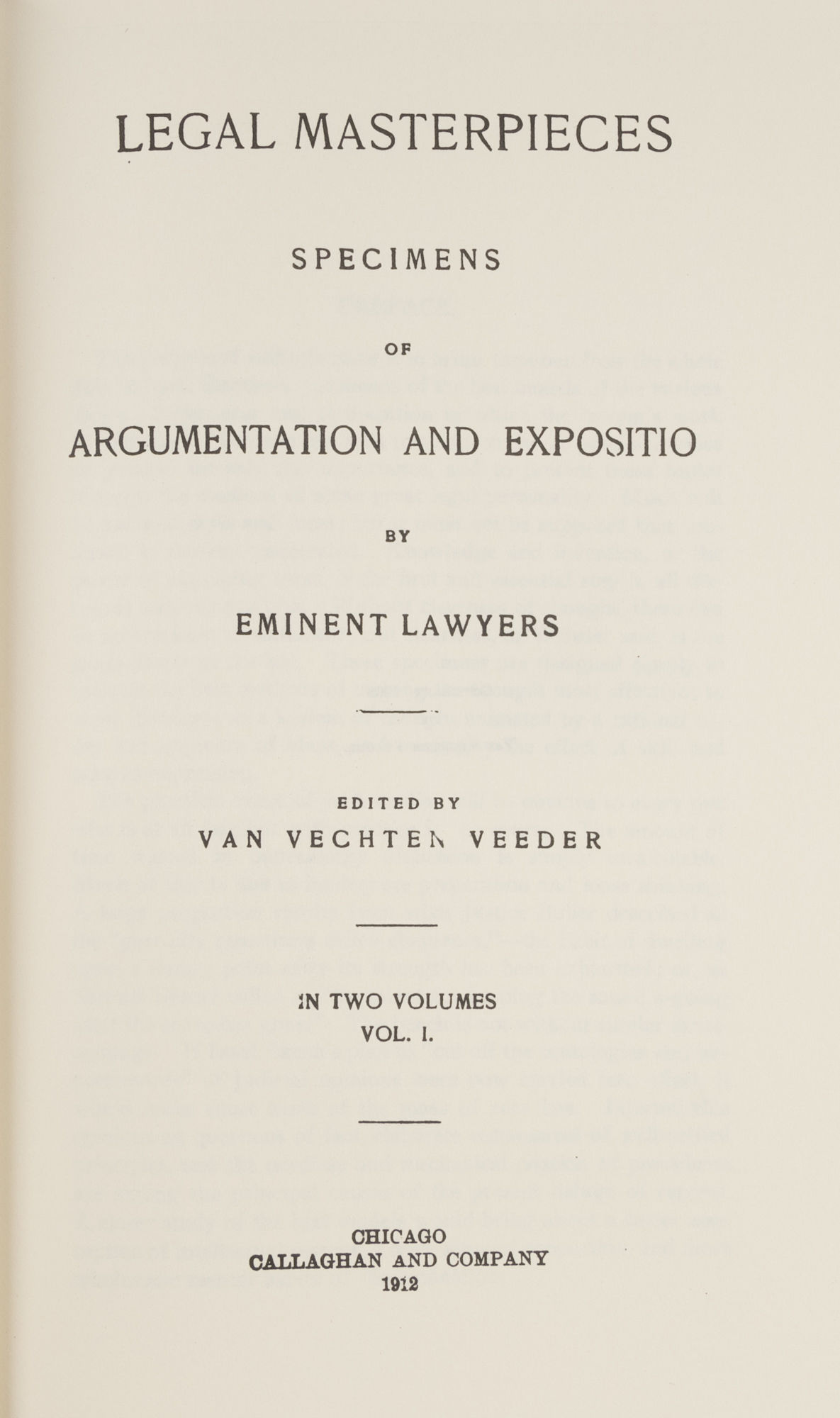 1974. Veeder, Van Vechten (editor). Legal Masterpieces: Specimens of Argumentation and Exposition By Eminent Lawyers. St. Paul, Minnesota: Keefe-Davidson Company, 1903. Reprinted W.S. Hein, 1974. Two volumes. New. $85. * "As he states in his preface, the editor of the collection has planned to 'bring together from the whole field of legal literature specimens of the best models of the various forms of discourse and composition in which the lawyer's work is embodied'...Mr. Veeder's editorial work deserves very high praise. To the whole collection he has prefixed an interesting and instructive study of forensic argument. At the beginning of the work of each jurist is placed a short biography, followed by a lengthy and careful criticism of that jurist's life, work, and influence." Harvard Law Review. Marke 226.