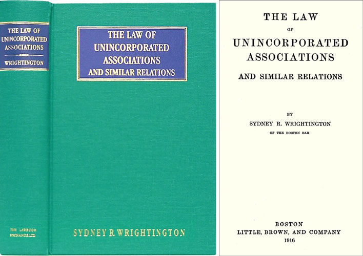 2002. ISBN-13: 9781584772057; ISBN-10: 1584772050. Wrightington, Sydney R. The Law of Unincorporated Associations and Similar Relations. Originally published: Boston: Little, Brown, and Company, 1916. xxvi, 486 pp. Reprinted 2002 by The Lawbook Exchange, Ltd. ISBN-13: 9781584772057; ISBN-10: 1584772050. Hardcover. New. $140. * "The first edition of this book was a pioneer work, and a distinct service to practitioners. It sought, within the compass of a moderate-sized volume, to treat comprehensively the law relating to all kinds of associations, whether or not organized for profit, not including corporations." Marke, A Catalogue of the Law Collection at New York University 746. With an appendix of forms.