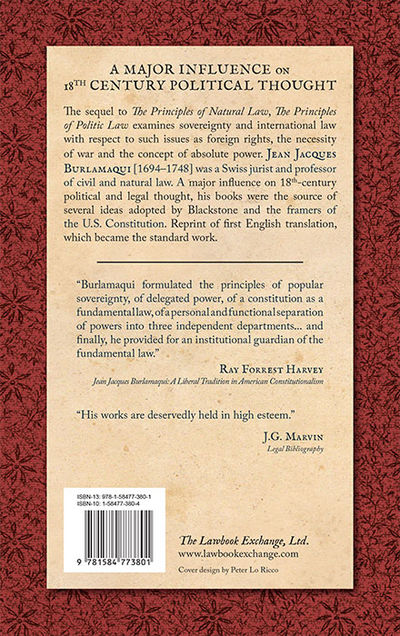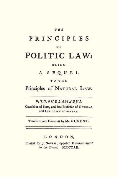 2004. ISBN-13: 9781584773801. ISBN-10: 1584773804. Burlamaqui, J[ean] J[acques]. The Principles of Politic Law: Being a Sequel to the Principles of Natural Law. Translated into English by Mr. Nugent. Originally published: London: J. Nourse, 1752. viii, 372 pp. Reprinted 2004 by The Lawbook Exchange, Ltd. ISBN-13: 9781584773801. ISBN-10: 1584773804. Hardcover. New. $23.95 * Here he develops his thesis that international law is based on natural law and examines the principles of sovereignty with respect to considerations such as foreign rights, the necessity of war, the concept of absolute power, public treaties and economic factors. Burlamaqui's views were a primary source of the theory voiced in the Declaration of Independence. The principles of his constitutional system are strikingly like those of the American, and he had considerable influence on Blackstone's lectures on jurisprudence. Reprint of first English translation. Sequel to Burlamaqui's other major work, The Principles of Natural Law (1748) (also published in reprint by The Lawbook Exchange, Ltd.). Jean Jacques Burlamaqui [1694-1748] was a Swiss jurist and professor of civil and natural law at Geneva.