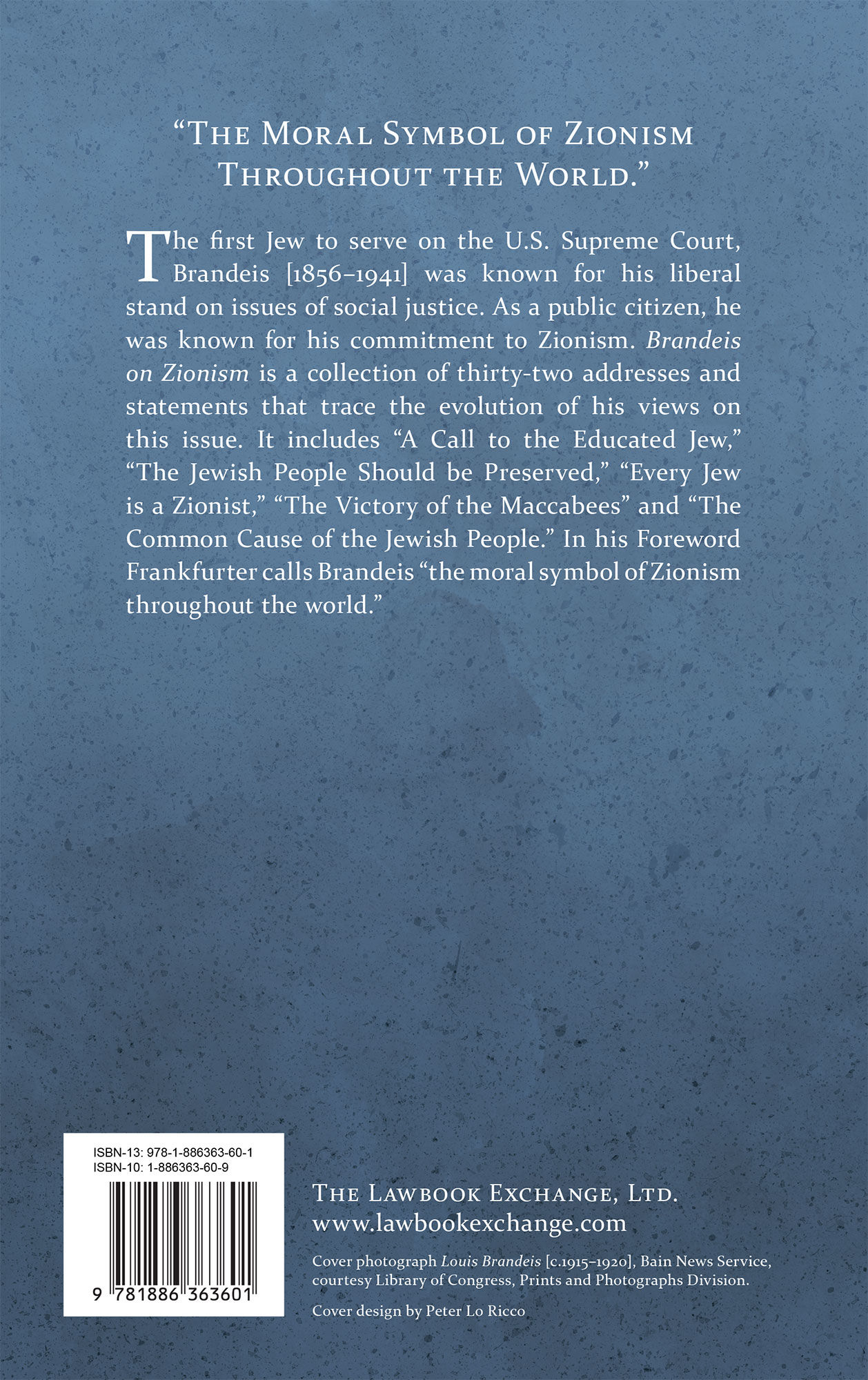 1999. ISBN-13: 9781886363601; ISBN-10: 1886363609. [Brandeis, Louis D.]. Brandeis on Zionism: A Collection of Addresses and Statements by Louis D. Brandeis With a Foreword by Mr. Justice Felix Frankfurter. Originally published: Washington, D.C.: Zionist Organization of America, [1942]. viii, 156 pp. Reprinted 1999, 2022 by The Lawbook Exchange, Ltd. ISBN-13: 9781886363601; ISBN-10: 1886363609. Hardcover. New. $34.95 * The first Jew to serve on the U.S. Supreme Court, Brandeis [1856-1941] was known for his liberal stand on issues of social justice. As a public citizen, he was known for his commitment to Zionism. Brandeis on Zionism is a collection of thirty-two addresses and statements that trace the evolution of his views on this issue. It includes "A Call to the Educated Jew," "The Jewish People Should be Preserved," "Every Jew is a Zionist," "The Victory of the Maccabees" and "The Common Cause of the Jewish People." In his Foreword Frankfurter calls Brandeis "the moral symbol of Zionism throughout the world.