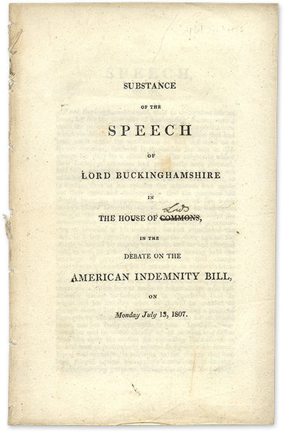1807. Buckinghamshire, Lord. Substance of the Speech of Lord Buckinghamshire in the House of Commons, in the Debate on the American Indemnity Bill, on Monday July 13, 1807. [Lincoln's Inn Fields: T. Gillet, 1807]. 8 pp. Leaflet. Small inkstains in parts of text. "Commons" crossed out on title page and "Lords" written as replacement in an early hand. Good. $50.