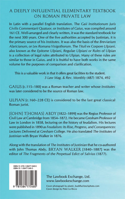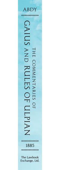 2014. ISBN-13: 9781584775485; ISBN-10: 1584775483. Gaius and Ulpian with Parallel Translations Abdy, J.T. and Bryan Walker. The Commentaries of Gaius and Rules of Ulpian. Translated with Notes by J.T. Abdy and Bryan Walker. Originally published: Cambridge: Cambridge University Press, 1885. xxvi, 501 pp. with two foldouts. Reprinted 2006, 2014 by The Lawbook Exchange Ltd. ISBN-13: 9781584775485; ISBN-10: 1584775483. Hardcover. New. $49.95 * In Latin with a parallel English translation. The Gaii Institutionum Juris Civilis Commentarii Quatuor, or Institutes of Gaius, was compiled around 161 CE. It is a deeply influential elementary textbook on Roman private law. Well-arranged and clearly written, it was the standard textbook for the next 300 years. One of the five authorities accepted by Justinian, it is the primary source of the Institutes. It was also the basis of the Breviarium Alaricianum, or Lex Romana Visigothorum. Gaius [c.115-180] was a teacher and writer who probably lived in Rome. The Tituli ex Corpore Ulpiani, also known as the Epitome Ulpiani, Regulae Ulpiani or Rules of Ulpian is a collection of legal rules attributed to Ulpian [c.160-228 CE], who is considered to be the last great classical Roman jurist. Many of the rules in this collection are similar to those in Gaius, and it is fruitful to have both works in the same volume for the purposes of comparison and clarification.