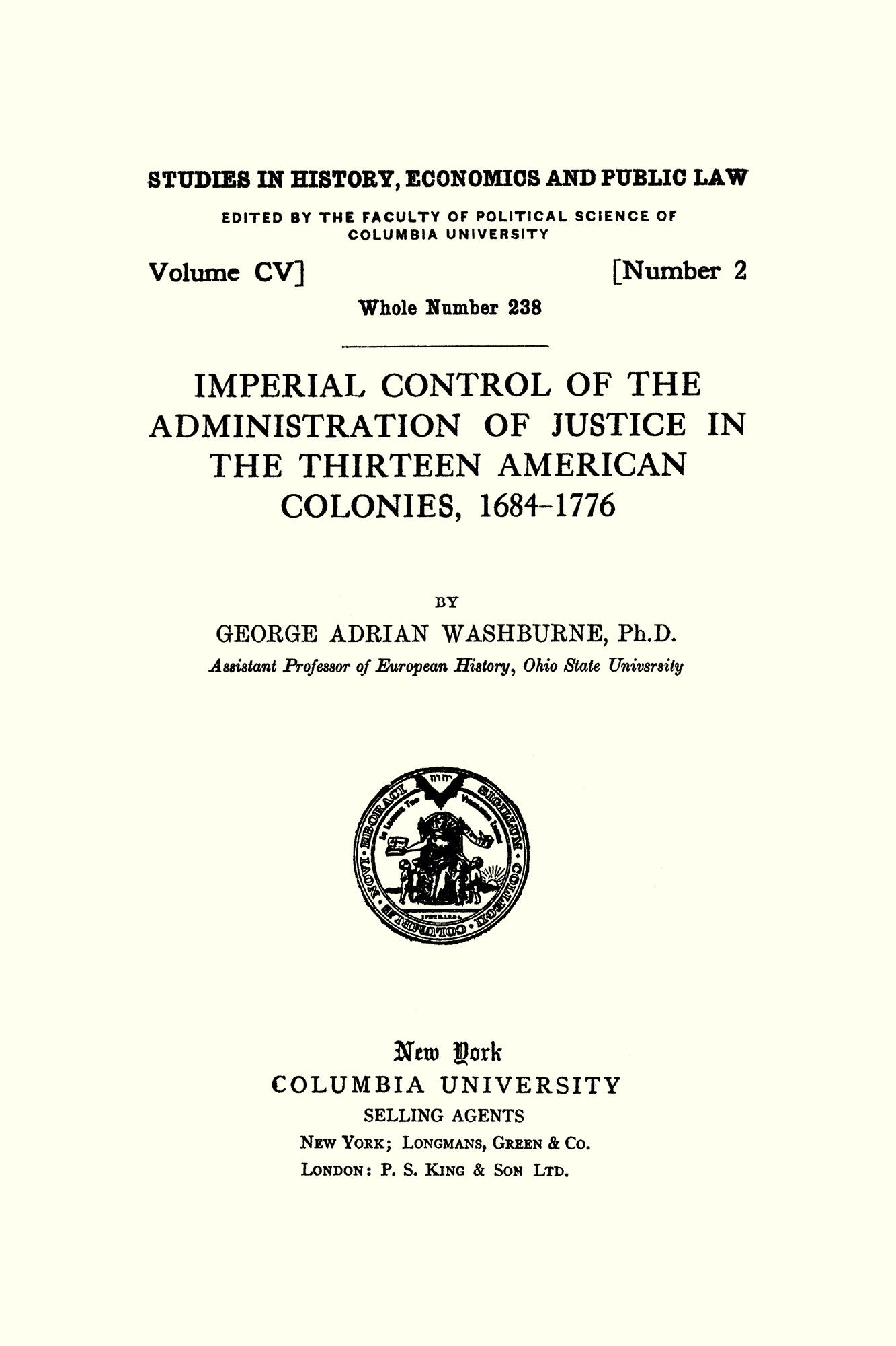 2012. ISBN-13; 9781584776215; ISBN-10: 1584776218. Washburne, George Adrian. Imperial Control of the Administration of Justice in the Thirteen American Colonies, 1684-1776. Originally published: New York: Columbia University Press, 1923. 191 pp. Reprinted 2006, 2012 by The Lawbook Exchange, Ltd. ISBN-13; 9781584776215; ISBN-10: 1584776218. Hardcover. New. $32.95 * The British government was certain that its American colonies would be governed by English law, but was uncertain about the nature of its legal institutions. The development of the legal system in the thirteen colonies, and the way English institutions were adapted to colonial conditions, is the subject of this monograph. Impressively documented, it is founded on original research based on manuscript sources in the United States and Great Britain. Reprint of a title in the Columbia University series Studies in History, Economics and Public Law. George Adrian Washburne [1884-1948] was a professor of history at Ohio State University. This work is based on his 1923 Ph.D thesis.