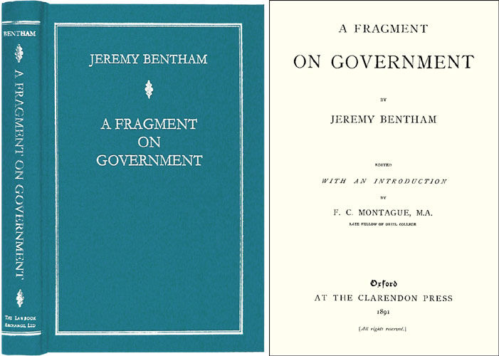 2001. ISBN-13: 9781584771661; ISBN-10: 1584771666. The First Significant Criticism of Blackstone's Commentaries Bentham, Jeremy. A Fragment on Government. Edited with an Introduction by F.C. Montague. Originally published: Oxford: The Clarendon Press, 1891. xii, 241 pp. Reprinted 2001 by The Lawbook Exchange, Ltd. ISBN-13: 9781584771661; ISBN-10: 1584771666. Hardcover. New. $29.95 * Bentham's first published work, an essay on sovereignty that criticizes Blackstone's Commentaries and attacks contemporary views on politics and law. This edition includes F.C. Montague's scholarly introduction that shows the significance of the Fragment and includes a biography of Bentham [1748-1832] and a discussion of his role in the history of jurisprudence. "The Fragment on Government is primarily a criticism. If it were nothing more, it would have no interest for later generations, which do not regard Blackstone as an authority upon speculative questions of politics or history, and therefore do not need to have Blackstone's theories corrected or disproved. But in criticizing Blackstone's views, Bentham necessarily expounds his own. As Bentham is one of the few English writers of mark upon the theory of political institutions, and as his doctrine forms a link in the chain of English political philosophy, we still read the Fragment of Government in order to see, not how far Blackstone was wrong, but how far Bentham was right.": Introduction 59. Laeuchli, A Bibliographical Catalog of William Blackstone 588.