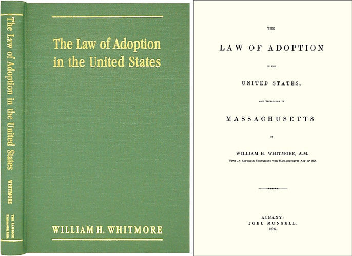2003. ISBN-13: 9781584773443; ISBN-10: 1584773448. American Adoption Law During the Nineteenth Century Whitmore, William H. The Law of Adoption in the United States, and Especially in Massachusetts. Originally published: Albany: Joel Munsell, 1876. vii, 111 pp. Reprinted 2003 by The Lawbook Exchange, Ltd. ISBN-13: 9781584773443; ISBN-10: 1584773448. Hardcover. New. $29.95 * Reprint of first and only edition. In 1875 the Massachusetts legislature considered a proposal to revise the state's adoption laws. Before it proceeded, however, it commissioned this study from Whitmore to serve as a reference for the legislators. Written in two parts, the first contains the texts of laws and related cases from twenty-two states. He also includes a brief summary of relevant European statutes. Organized by topic, the second part describes how these laws compare and differ. Though written for a specific purpose, this study remains a valuable guide for the scholar of the history of adoption law or family law to all aspects of American adoption law during the nineteenth century.