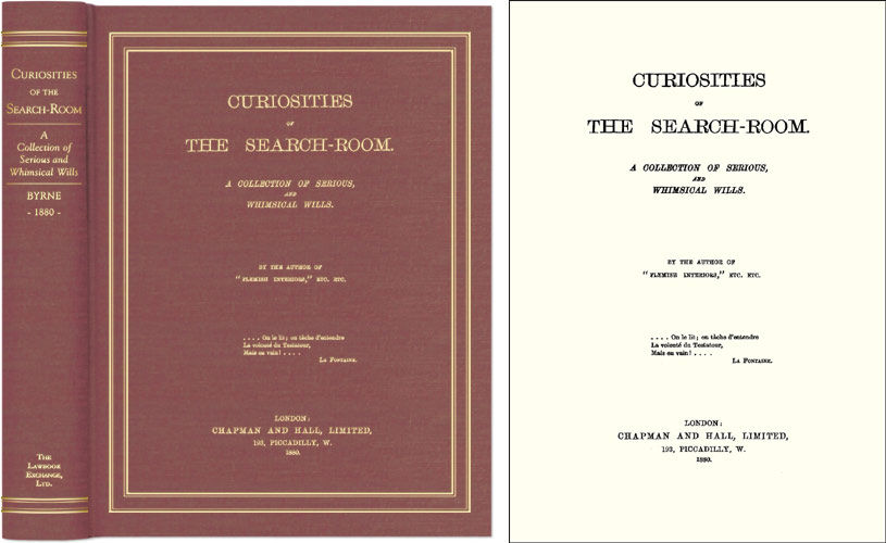 2005. ISBN-13: 9781584775904. ISBN-10: 1584775904. [Byrne, Wm. Pitt (Julia C.), Mrs., Compiler]. Curiosities of the Search-Room: A Collection of Serious, and Whimsical Wills. Originally published: London: Chapman and Hall, 1880. ix, 407 pp. Reprinted 2005 by The Lawbook Exchange, Ltd. ISBN-13: 9781584775904. ISBN-10: 1584775904. Hardcover. New. $24.95 * Byrne [1819-1894] describes this collection of colorful wills as "a series of romantic narratives." Some are so romantic, in fact, that "those who are at a loss for the plot of a new novel might dip into this collection for novel materials" (ii). Contents include "Excentric Wills," "Puzzling Wills," "Wills in Obsolete Language and in Rime," "Vindictive Wills," "Bequests to Wives," "Wills in Favour of Dumb Animals," "Disputed Wills" and "Wills of Remarkable Persons.